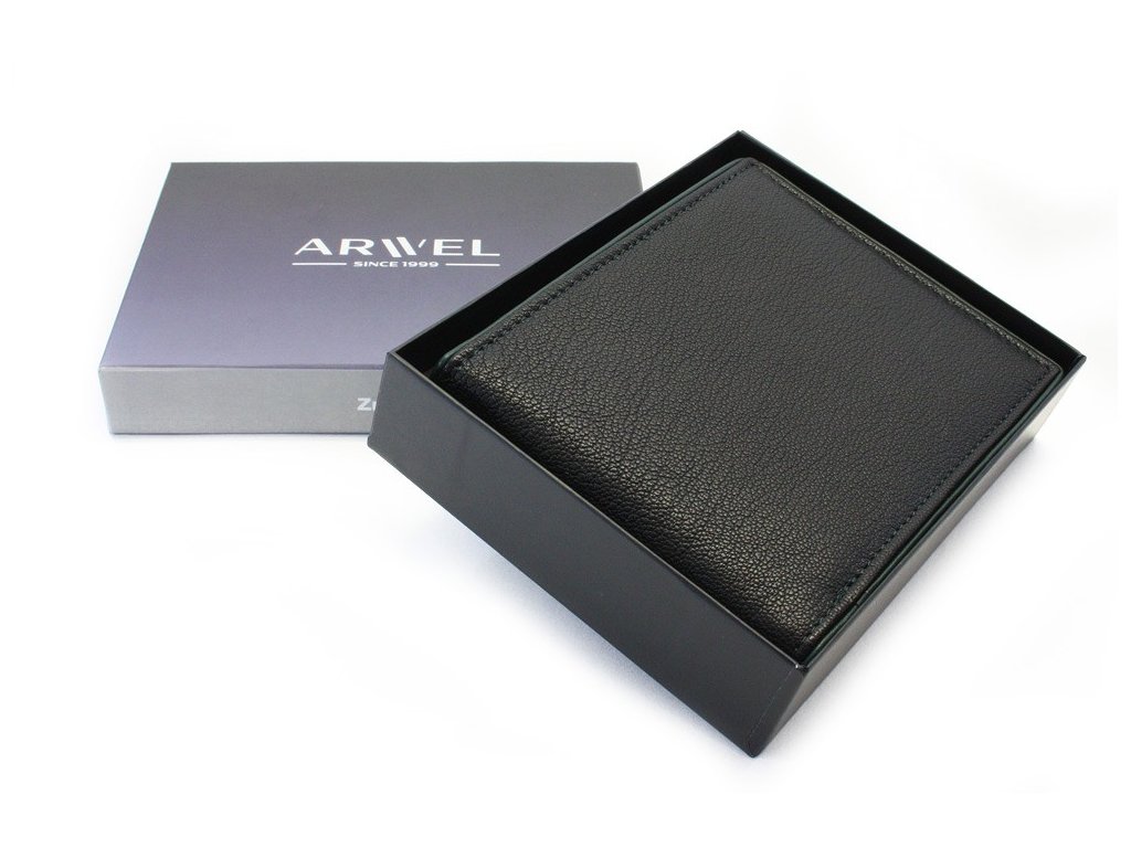 Moderní pánská peněženka obsahuje 2 přihrádky na bankovky, kapsa na mince, 9 kapes na kreditní karty, 2 průhledná okna a 2 skryté boční kapsy kryté zápinkou. Prostřední kapsa je na zip.