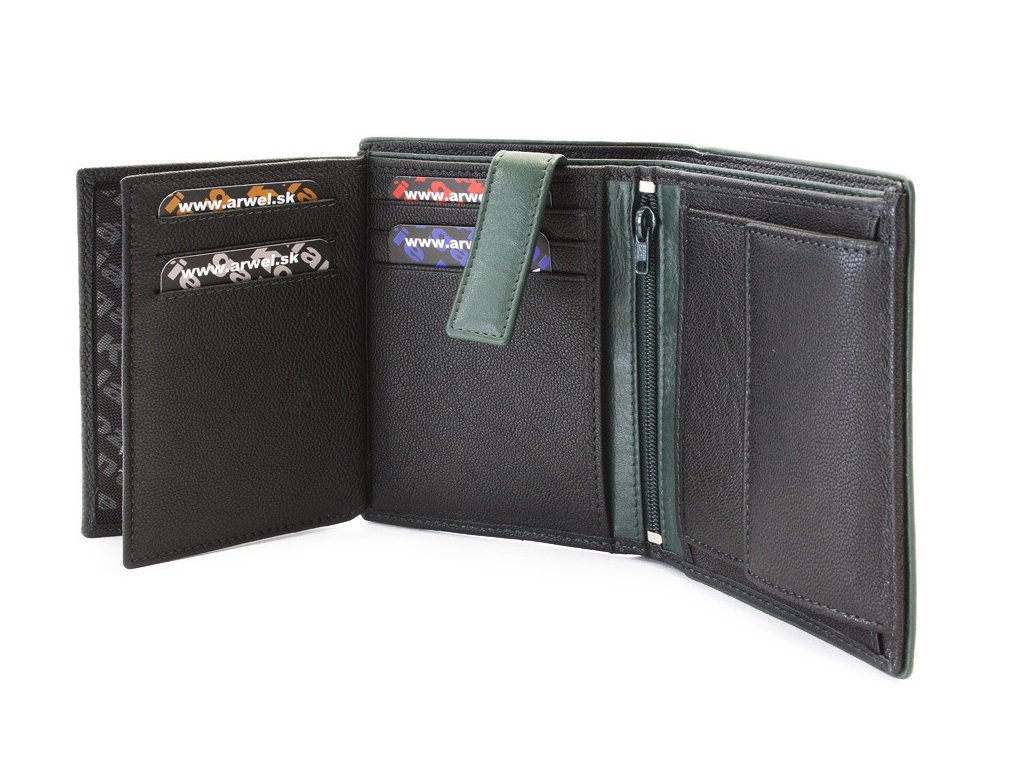 2 přihrádky na bankovky, klopnová kapsa na mince, 9 kapes na kreditní karty, občanský průkaz nebo řidičský průkaz, vnitřní zipová kapsička, 2 velké průhledné kapsy, 2 skryté kapsy. Tmavě zelené šití.