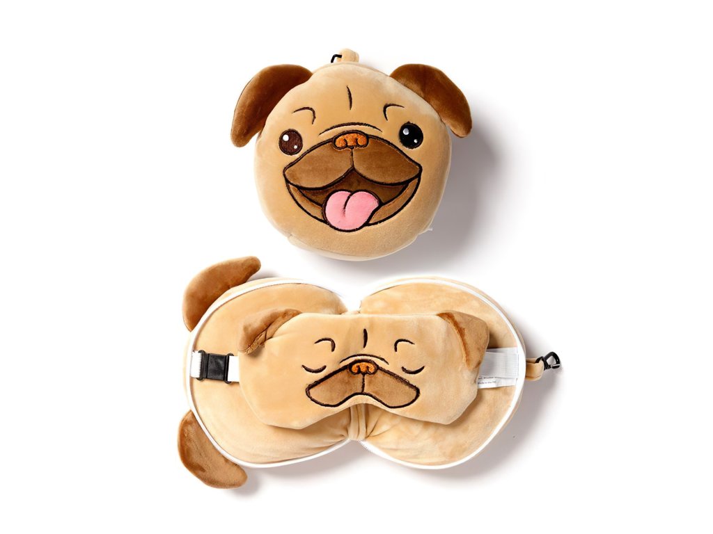 Užijte si pohodlný spánek a relaxaci i během cestování s títmo skvělým cestovním polštářem a maskou na oči v designu pejska Mopsíka. S touto sadou si můžete dopřát maximální pohodlí a odpočinek, ať už jste v letadle, vlaku, autě nebo autobuse. Cestovní polštář je navržen tak, aby poskytoval optimální podporu pro vaši hlavu a krk, zatímco maska na oči blokuje rušivé světlo a umožňuje vám naplno relaxovat. S motivem roztomilého pejska Mopsíka je tato sada nejenom praktická, ale i zábavná pro vaše cestování. Sada je vyrobena z příjemného pohodlného plyšového materiálu. Maska na oči je připevněna k polštářku gumičkou, která je na jedné straně rozepínatelná.