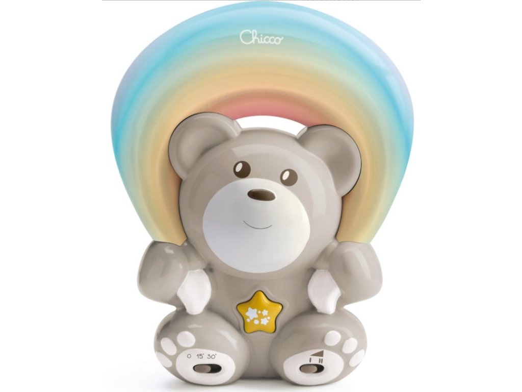 Chicco Medvídek s projektorem duhy a melodií. Rainbow Projector Teddy Bear je projektor, který díky překvapivým projekcím magické duhy jemně osvětlí dětský pokojíček a navodí příjemnou uklidňující atmosféru před spaním. Průměty duhy na stěnu a strop si můžete upravit! Popis: - 2 režimy projekce a melodie: - statická duhová projekce zobrazující všechny vaše barvy současně s klasickou hudbou. - pohyblivá duhová projekce s melodiemi New Age. - postupné zobrazování monochromatických barev. - 360° otočné zrcadlo umožňuje nastavit šířku a směr promítání duhy na stěnu nebo strop v závislosti na prostoru a poloze objektu. - Lampa má časovač - rodiče si mohou vybrat cyklus promítání 15 nebo 30 minut a hudbu - klasické melodie. Rozměry:13 × 8,5 × 19 cm. Baterie 3x AAA - 1,5 Volt, nejsou součástá balení. Vhodné pro děti od narození.Doplňkové parametry