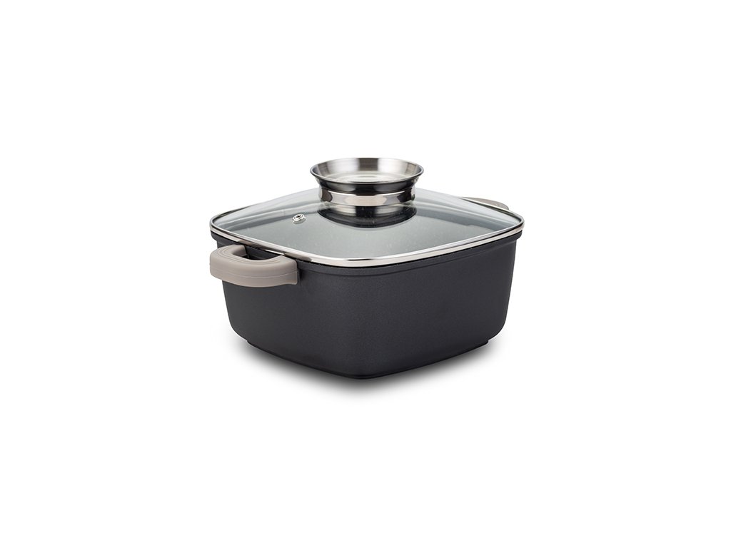 Zapékací hrnec o o rozměrech 28x28 cm je ideální pro každodenní použití v kuchyni. Kombinuje kvalitu s moderním designem. Jedná se o praktický hrnec vyrobený z litého hliníku s nepřilnavým povrchem bez PFOA. Ergonomické rukojeti s odnímatelnými silikony pro příjemné a bezpečné uchopení. Součástí je poklice s odolným termo úchytem. Vynikající rozložení teploty pro dokonalou přípravu jídel. Snadno se čistí, je vhodný i do myčky na nádobí. Hrnec je vhodný i pro použití v troubě (bez úchytů). Hrnec má průměr základny 18,5 cm, výšku 16 cm a objem 6,3 l. Váha 2 kg