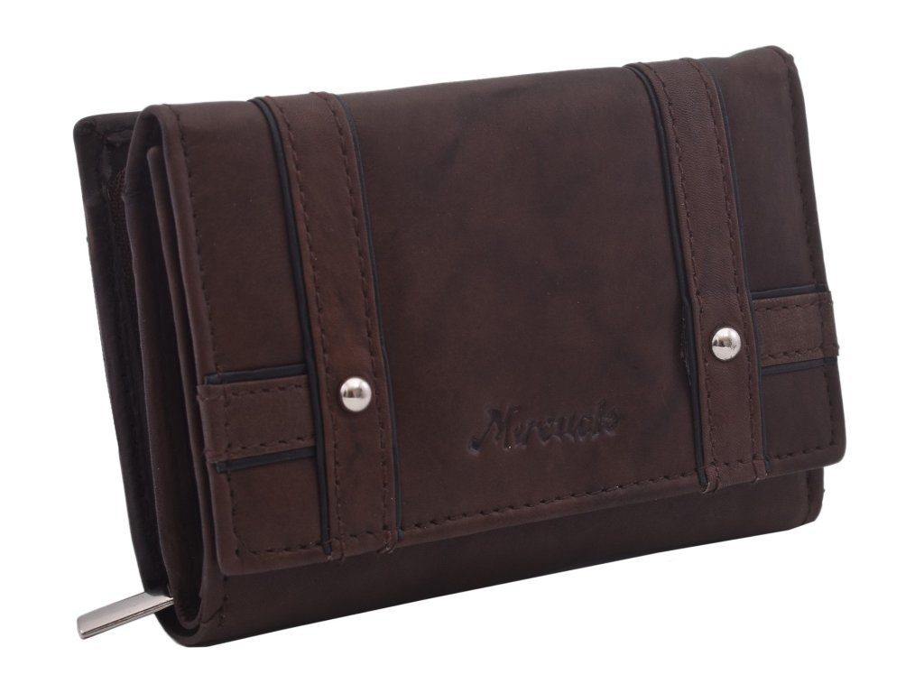 Oblíbená kožená peněženka pro ženy přichází také v decentní hnědé verzi. Přední část peněženky je lemována dvěma vystouplými pásy ve stejné barvě. Vnitřek peněženky má složení, které je typické pro krátké kožené peněženky tohoto typu, a to jsou pouze nezbytné přihrádky na doklady, šikovnou přepážku na bankovky a, samozřejmě, nesmí chybět ani velká kapsa na mince na zadní straně peněženky, která je uprostřed rozdělena.