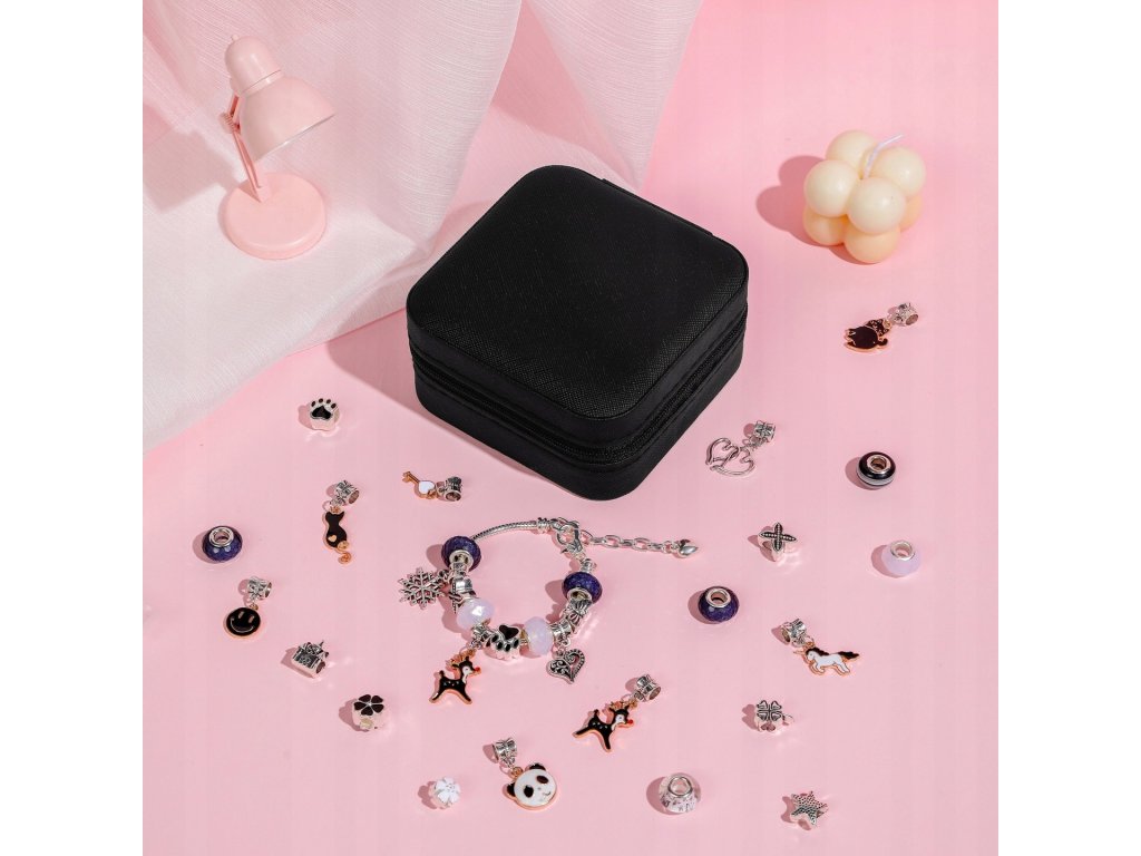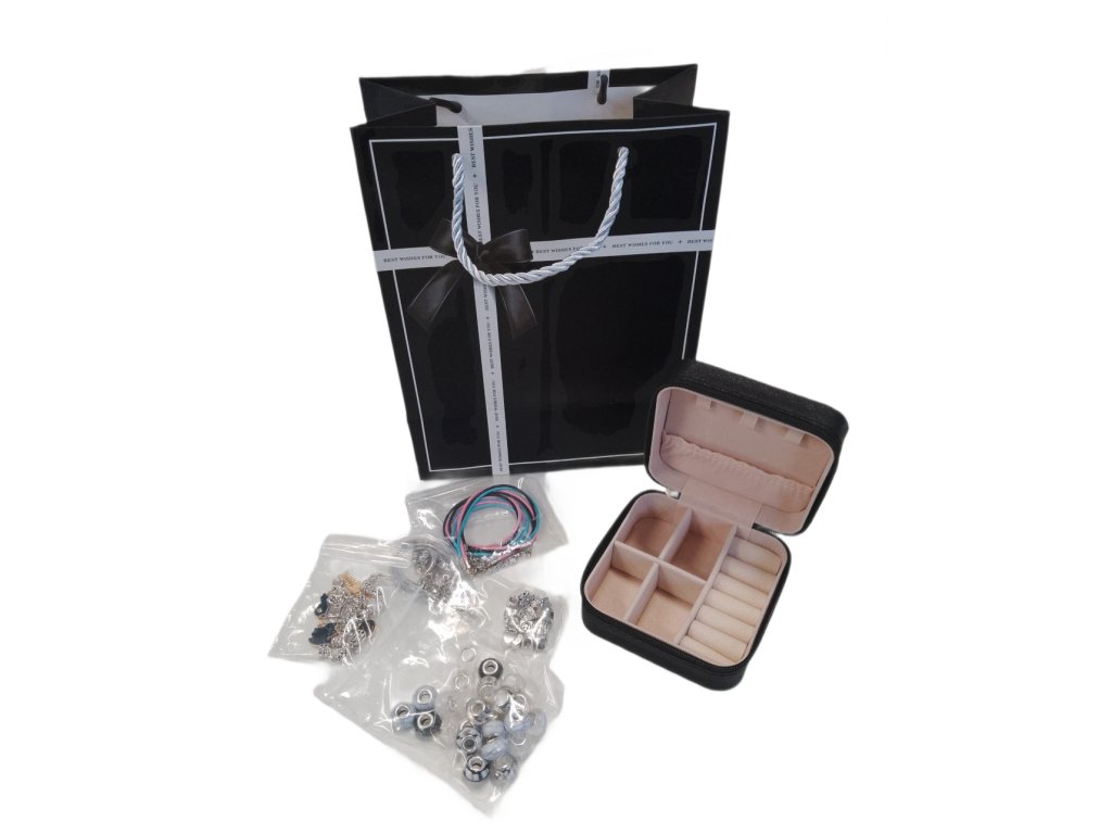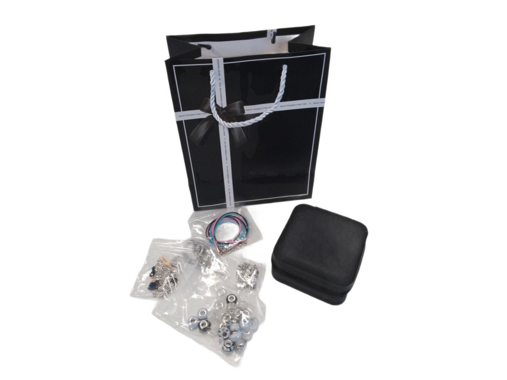 V elegantním balení najdete vše potřebné k vytvoření originálních doplňků přesně podle svého stylu. Černá dárková taška s jemnou stuhou a decentní krabička s přihrádkami z hebkého semišového materiálu zajistí, že budou všechny komponenty vždy bezpečně uložené.