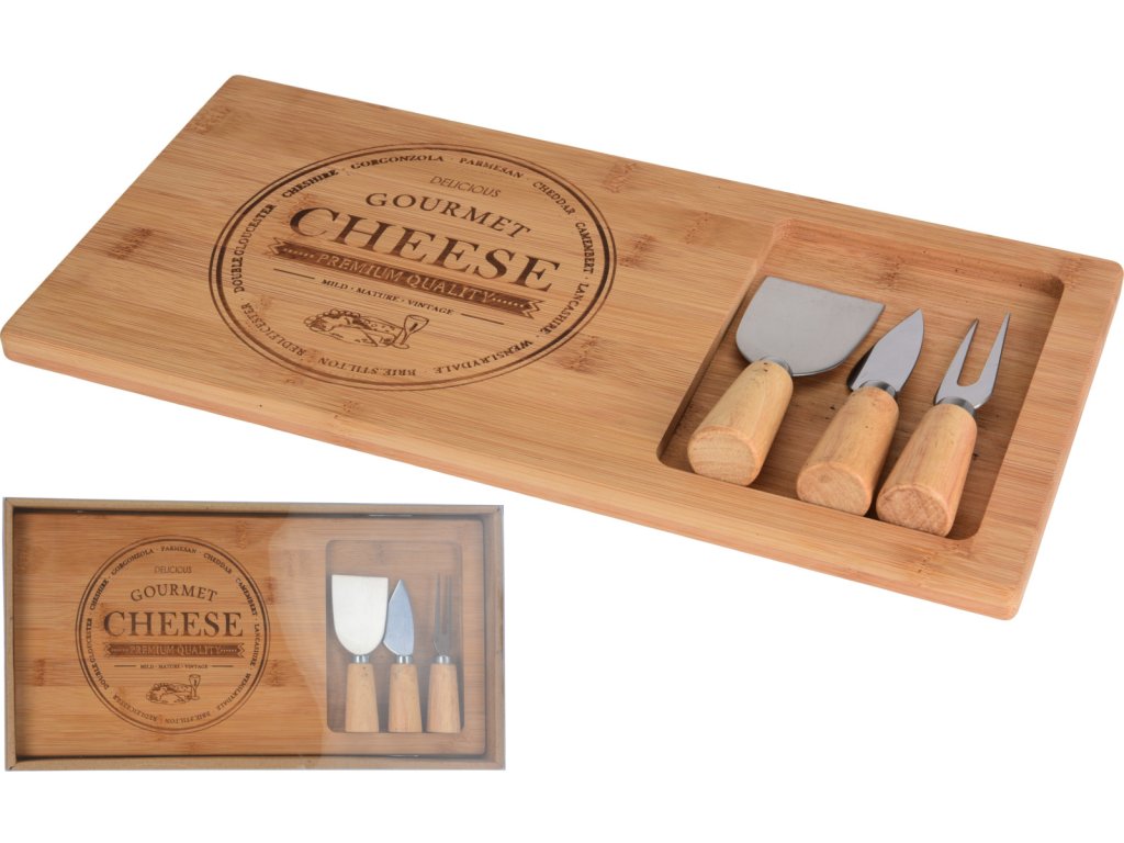Servírovací sada na sýr je vyrobena z bambusu v kombinaci s nerezovou ocelí. Sadu ocení každý labužník sýrů. V sadě naleznete 3 nástroje na servírování sýrů a servírovací podložku, která slouží i jako prkénko.