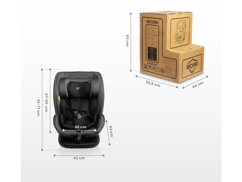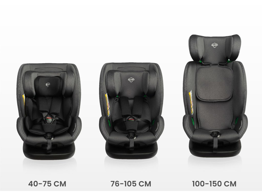 Autosedačka Securo – inovativní bezpečí a maximální komfort na cestách. Securo je moderní dětská autosedačka, která splňuje nejpřísnější bezpečnostní normy i-Size (ECE R129) a je určena pro děti od 40 do 150 cm. Díky otočné základně o 360° je manipulace s dítětem rychlá a pohodlná, což oceníte při každodenním používání i na delších cestách. Instalace je možná pomocí ISOFIX a Top Tether nebo kombinací ISOFIX a bezpečnostních pásů, což zajišťuje maximální flexibilitu a bezpečnost. Hlavní výhody autosedačky Securo: - Vhodná pro děti od narození do cca 12 let (40–150 cm). - Otočné sedadlo 360° pro snadné usazení a vyjmutí dítěte. - Montáž po i proti směru jízdy podle výšky dítěte. - Čtyřstupňová regulace sklonu opěrky pro pohodlí při jízdě i spánku. - Osmistupňová regulace výšky opěrky hlavy (až 24 cm). - Vyjímatelná ergonomická vložka pro novorozence. - Pětibodové bezpečnostní pásy s jednoduchým nastavením délky. - Pokročilá boční ochrana SIP (Side Impact Protection). - Kvalitní měkký potah z polyesteru – snadná údržba a dlouhá životnost. - Moderní design a robustní konstrukce z odolných materiálů. Technické parametry: - Norma: ECE R129/02 (i-Size). - ISOFIX: ano. - Otočné sedadlo: ano (360°). - Hmotnost: 13 kg. - Vnější rozměry: 43 × 52 × 61–77 cm. - Vnitřní rozměry: 30 × 28 cm (sedák), opěrka s opěrkou hlavy 47–69 cm. - Rozměry balení: 53 × 45 × 65 cm. Autosedačka Securo je ideální řešení pro bezpečné a pohodlné cestování s dětmi od narození až do školního věku. Nabízí nejvyšší úroveň ochrany, jednoduchou manipulaci a pohodlí i na dlouhých cestách.Doplňkové parametry