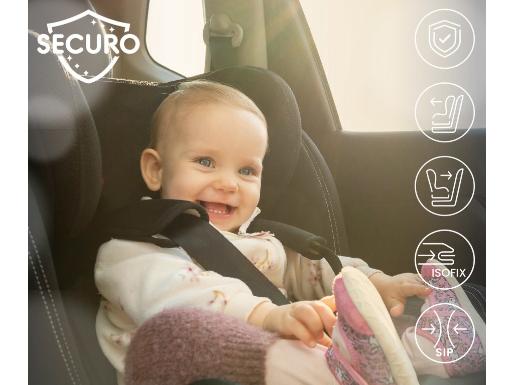 Autosedačka Securo – inovativní bezpečí a maximální komfort na cestách. Securo je moderní dětská autosedačka, která splňuje nejpřísnější bezpečnostní normy i-Size (ECE R129) a je určena pro děti od 40 do 150 cm. Díky otočné základně o 360° je manipulace s dítětem rychlá a pohodlná, což oceníte při každodenním používání i na delších cestách. Instalace je možná pomocí ISOFIX a Top Tether nebo kombinací ISOFIX a bezpečnostních pásů, což zajišťuje maximální flexibilitu a bezpečnost. Hlavní výhody autosedačky Securo: - Vhodná pro děti od narození do cca 12 let (40–150 cm). - Otočné sedadlo 360° pro snadné usazení a vyjmutí dítěte. - Montáž po i proti směru jízdy podle výšky dítěte. - Čtyřstupňová regulace sklonu opěrky pro pohodlí při jízdě i spánku. - Osmistupňová regulace výšky opěrky hlavy (až 24 cm). - Vyjímatelná ergonomická vložka pro novorozence. - Pětibodové bezpečnostní pásy s jednoduchým nastavením délky. - Pokročilá boční ochrana SIP (Side Impact Protection). - Kvalitní měkký potah z polyesteru – snadná údržba a dlouhá životnost. - Moderní design a robustní konstrukce z odolných materiálů. Technické parametry: - Norma: ECE R129/02 (i-Size). - ISOFIX: ano. - Otočné sedadlo: ano (360°). - Hmotnost: 13 kg. - Vnější rozměry: 43 × 52 × 61–77 cm. - Vnitřní rozměry: 30 × 28 cm (sedák), opěrka s opěrkou hlavy 47–69 cm. - Rozměry balení: 53 × 45 × 65 cm. Autosedačka Securo je ideální řešení pro bezpečné a pohodlné cestování s dětmi od narození až do školního věku. Nabízí nejvyšší úroveň ochrany, jednoduchou manipulaci a pohodlí i na dlouhých cestách.Doplňkové parametry