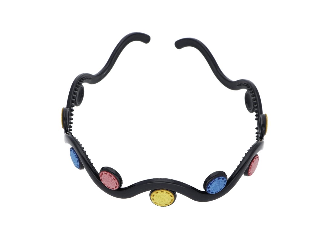 Plastová čelenka s puntíkem. Balení obsahuje 1 ks. Rozměr: šířka čelenky 0,6 cm. Rozměr ozdoby průměr 1,3 cm.