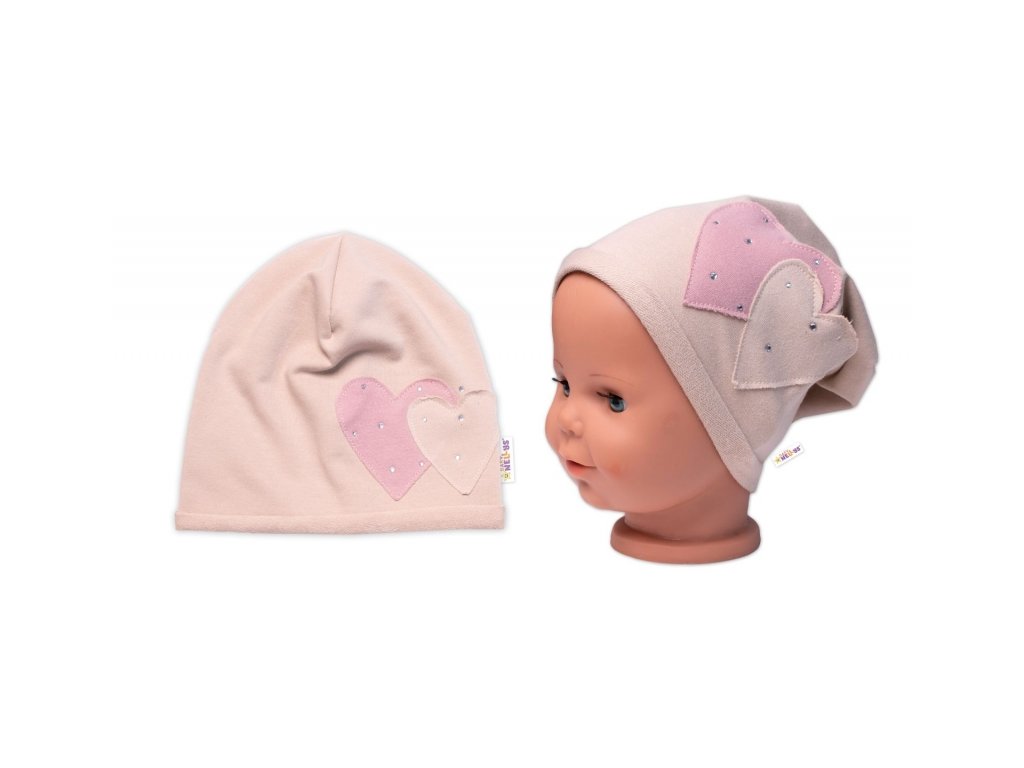 Dětská čepice bavlna, Srdíčka s kamínky, Baby Nellys, béžová