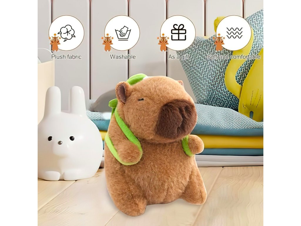 Plyšová kapybara je ztvárněna s jemným úsměvem a veselými detaily, což jí dodává přátelský a uklidňující vzhled. Díky svému měkkému provedení působí velmi příjemně na dotek.