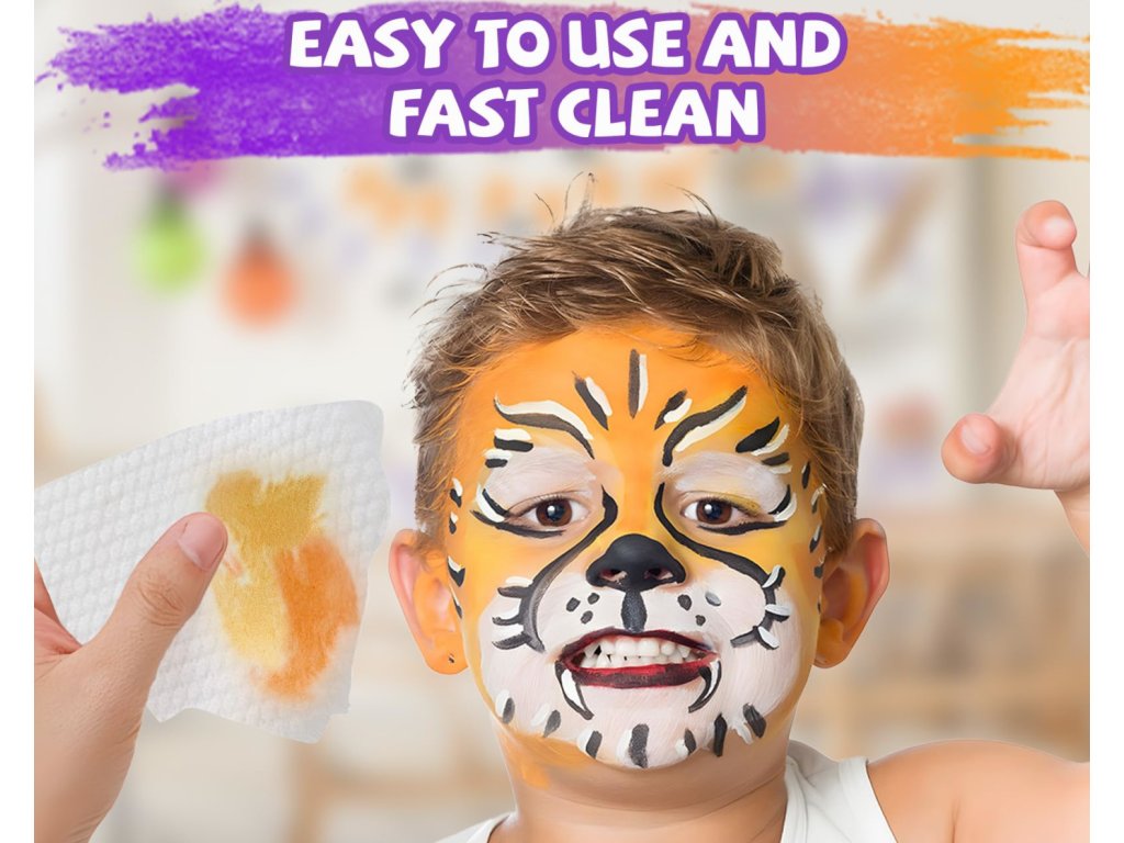 Barvy jsou jemné, netoxické a dermatologicky šetrné, takže jsou bezpečné pro citlivou dětskou pokožku. Nanášejí se jednoduše pomocí přiloženého aplikátoru nebo prstů a snadno se smývají vodou a mýdlem, bez potřeby speciálních odstraňovačů. Součástí balení je také malá tubička doplňkové barvy a vatový aplikátor.