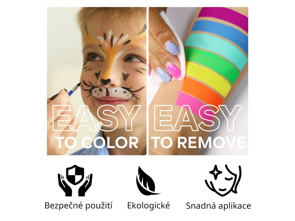 Barvy nezpůsobují podráždění a jsou bezpečné i pro citlivější typy pleti. Sada je ideální pro kreativní malování na tvář i tělo.