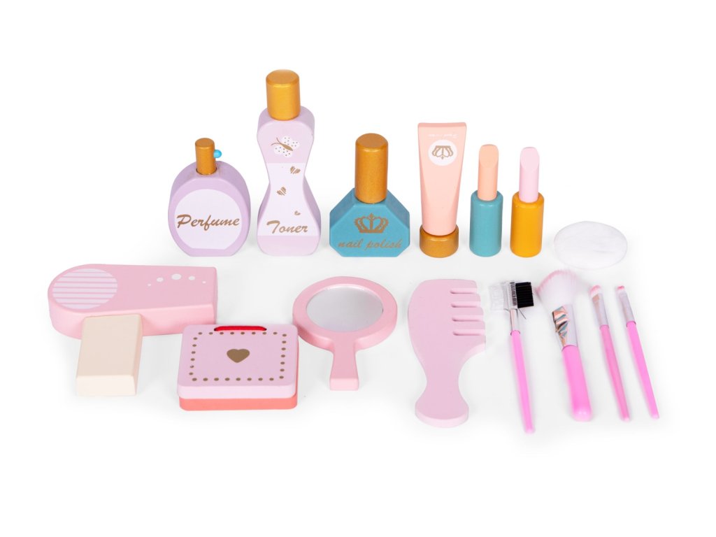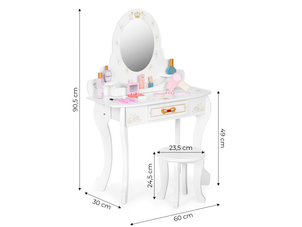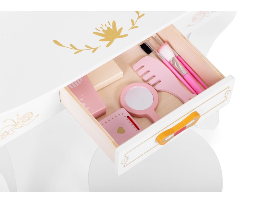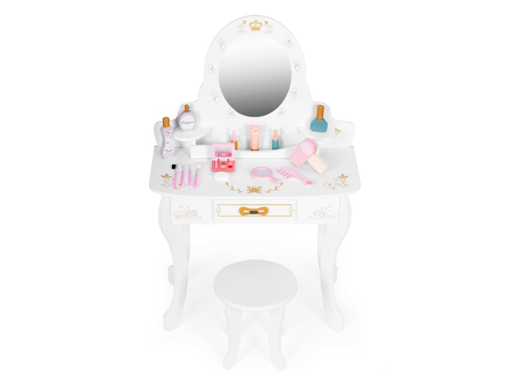 Velká dětská toaletka se zrcadlem a doplňky Tato krásná dřevěná toaletka je navržena pro malé slečny od 3 let. Vyrobena je z kvalitního dřeva bez ostrých hran, takže je zcela bezpečná pro děti. Velká hrací deska nabízí dostatek prostoru pro dětskou kosmetiku a další doplňky. Zrcadlo s ozdobným rámečkem a korunkou dodává toaletce kouzelný vzhled, který zaujme každou malou princeznu. Nechybí výsuvná zásuvka na doplňky ani pohodlná stolička pro pohodlné sezení. V sadě je také několik drobných doplňků, které rozvíjejí dětskou představivost a jemnou motoriku. Kouzelná toaletka pro malé slečny Tento toaletní stolek obsahuje spoustu doplňků, které potěší každou malou dámu. Děti se mohou hravou formou vžít do role vizážistky, modelky nebo princezny. Při hraní rozvíjejí jemnou motoriku, trpělivost i kreativitu a zároveň se seznamují se základy líčení. Toaletka poskytuje prostor nejen pro hru, ale i pro rozvoj fantazie a smyslu pro pořádek. Dřevěné doplňky pro kreativní hraní Součástí sady jsou dřevěné hrací doplňky, které rozšiřují možnosti zábavy. Děti zde najdou fén, kartáč, malé zrcátko, sadu kosmetiky a štětců na líčení. Všechny prvky jsou bez ostrých hran, a proto jsou naprosto bezpečné pro děti. Díky těmto doplňkům může každá holčička napodobit ranní přípravy své maminky a hrát si na malou vizážistku. Pořádek a přehled na dosah Toaletka je vybavena velkou výsuvnou zásuvkou, do které se snadno vejdou všechny doplňky a kosmetika. Vedle zrcadla jsou umístěny také dvě praktické poličky, které umožňují přehledné uspořádání drobností. Díky tomuto chytrému řešení bude mít dítě na stolku vždy čistotu a pořádek. Specifikace produktu Vhodné pro děti od: 3 let. Materiál: MDF, dřevo. Rozměry: 60 × 30 × 90,5 cm. Rozměry balení: 66,5 × 46 × 17,5 cm. Hmotnost: 7,7 kg. Značka: ECOTOYS. Upozornění: Obal není hračka, odstraňte ho z dosahu dítěte. Nenechávejte dítě samo bez dozoru. Dbejte pokynu výrobce.Doplňkové parametry