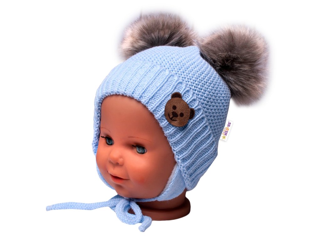 Dětská zimní čepice s fleecem Teddy Bear - chlupáčk. bambulky,sv. modrá, šedá