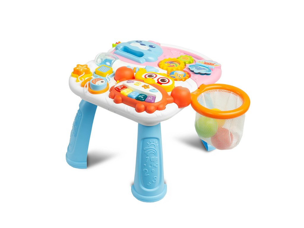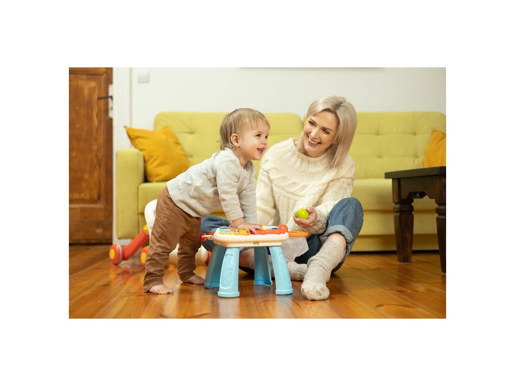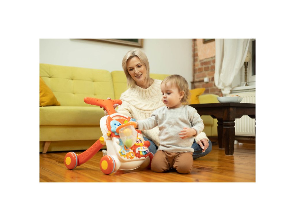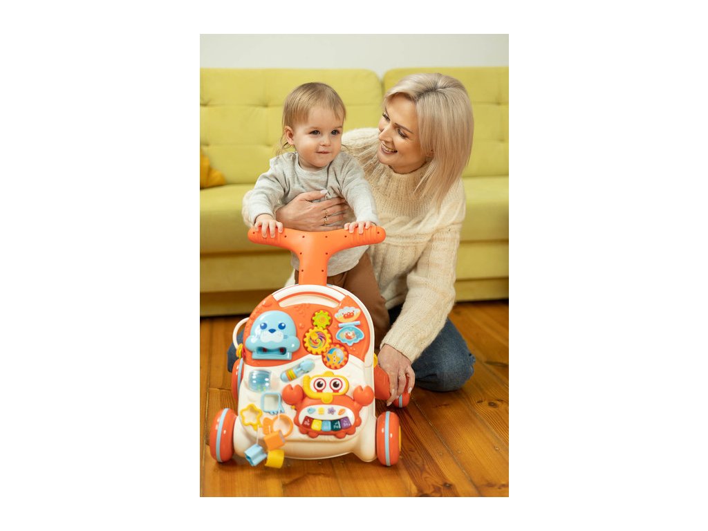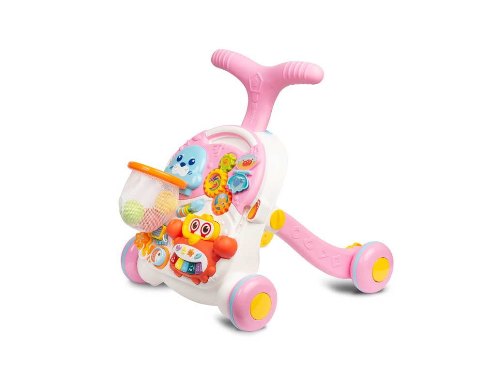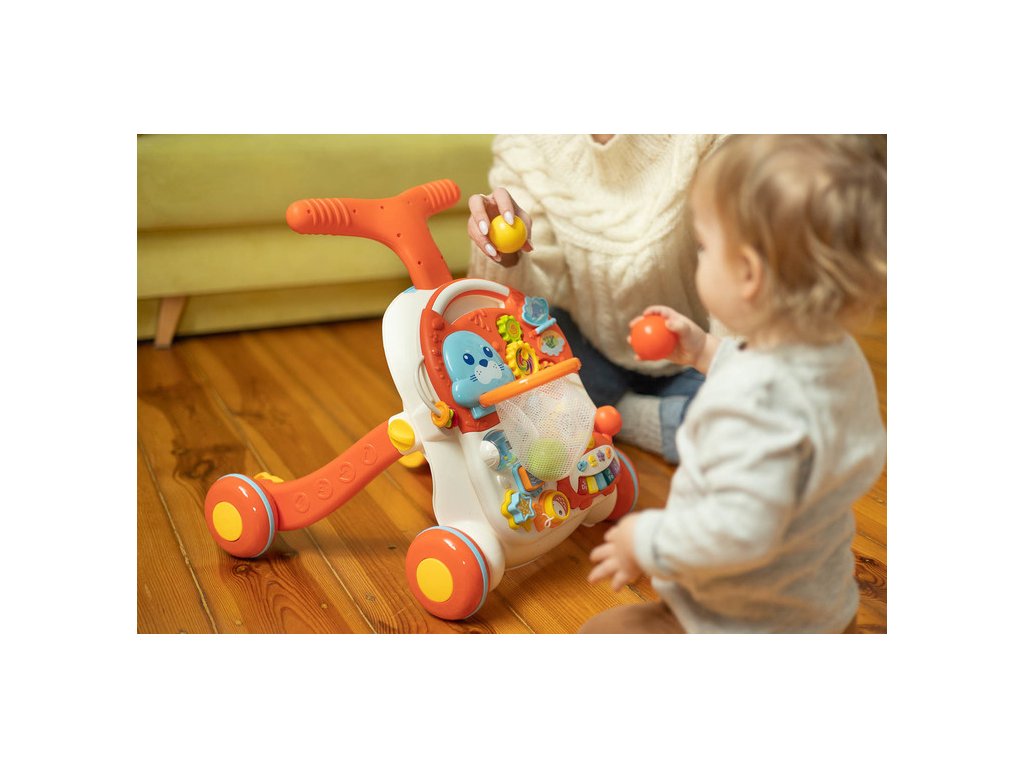 Dětské interaktivní chodítko, stoleček s příslušenstvím 2v1. Vzdělávací hračka z řady TOYZ Activity, ideální pro dítě, které již začalo dělat první krůčky. Díky kombinaci několika možností v jedné hračce zabaví vaše batole na mnoho hodin. Dá se použít jako odstrkovadlo nebo interaktivní stůl se spoustou atrakcí. Čas zpříjemní košík, do kterého může vložit 3 plastové míčky s chrastítkem, bateriové a odnímatelné piano ve tvaru kraba, točící se ozubená kola a mnoho dalších překvapení. Přední panel lze sejmout a proměnit v hrací stolek. Vlastnosti: - stabilní a pevná konstrukce, - podporuje chůzi, rovnováhu a cvičení, - četné barevné hračky, které stimulují vývoj, - výsuvné piano na baterie s 5 tlačítky, - 2 v 1 – odsunovací a hrací stůl, - 2 úrovně nastavení výšky řídítek (48 cm, 46 cm), - zadní kola s aretací. Rozměry: chodítko: 47x44x48 cm, stoleček: 33x37x24 cm, Hmotnost: 2,65 kg, rozměry balení: 68x11x39 cm, věkové rozmezí: od 12 měsíců. Baterie: 3 X 1.5 V AAA (nejsou součástí balení). UPOZORNĚNÍ: Nikdy nenechte děti hrát si s bateriemi.Doplňkové parametry