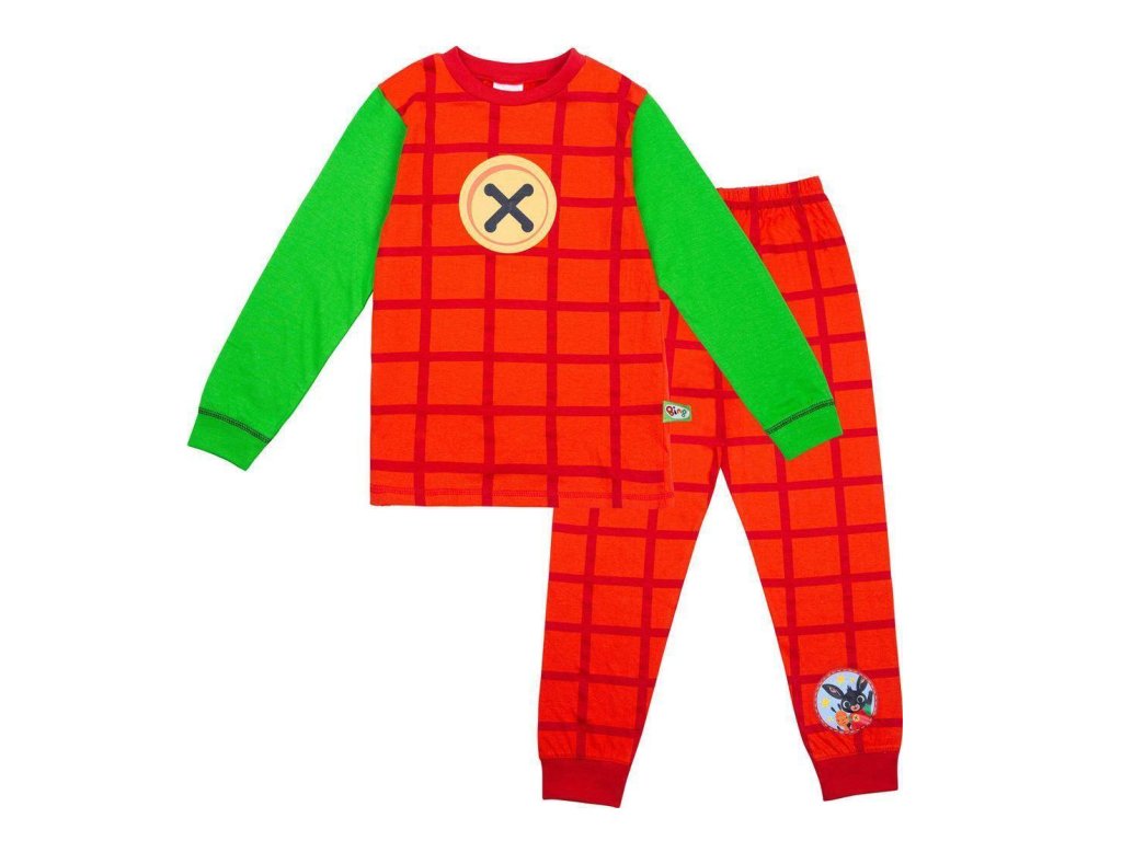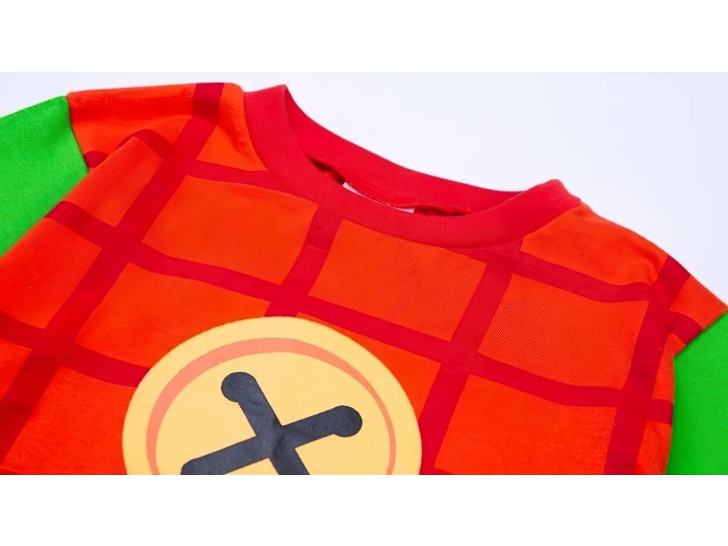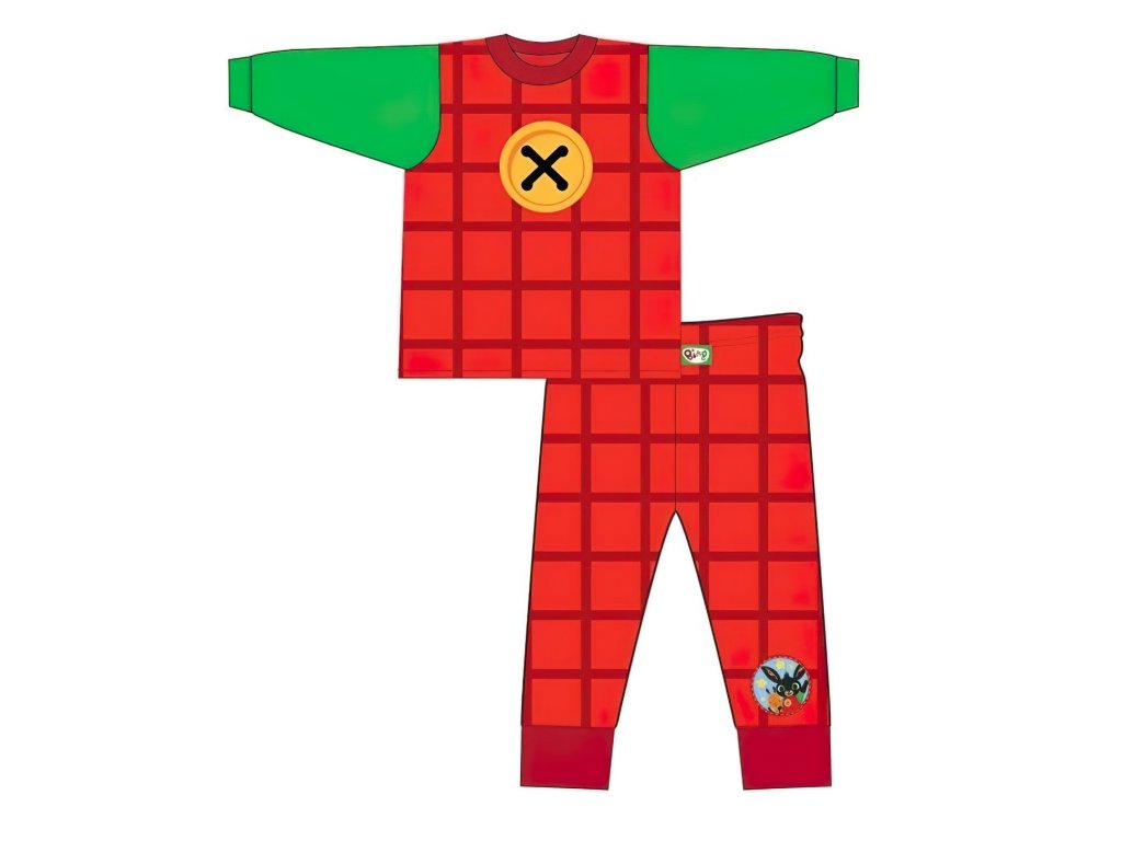 Vrchní díl pyžama má jasně červenou barvu s kostkovaným vzorem a zelenými rukávy, což vytváří veselou barevnou kombinaci, která zaujme každé dítě. Na přední straně dominuje ikonický žlutý znak s černým "X", který je součástí vzhledu králíčka Binga a dodává pyžamu autentický a zároveň zábavný vzhled. Zelené rukávy přidávají na barevné rozmanitosti a doplňují červenou barvu v kontrastním, přesto harmonickém stylu.