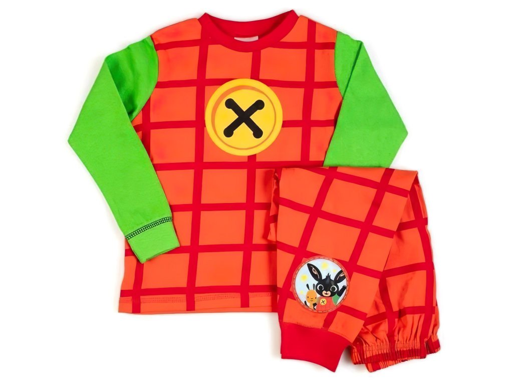 Vrchní díl pyžama má jasně červenou barvu s kostkovaným vzorem a zelenými rukávy, což vytváří veselou barevnou kombinaci, která zaujme každé dítě. Na přední straně dominuje ikonický žlutý znak s černým "X", který je součástí vzhledu králíčka Binga a dodává pyžamu autentický a zároveň zábavný vzhled. Zelené rukávy přidávají na barevné rozmanitosti a doplňují červenou barvu v kontrastním, přesto harmonickém stylu.