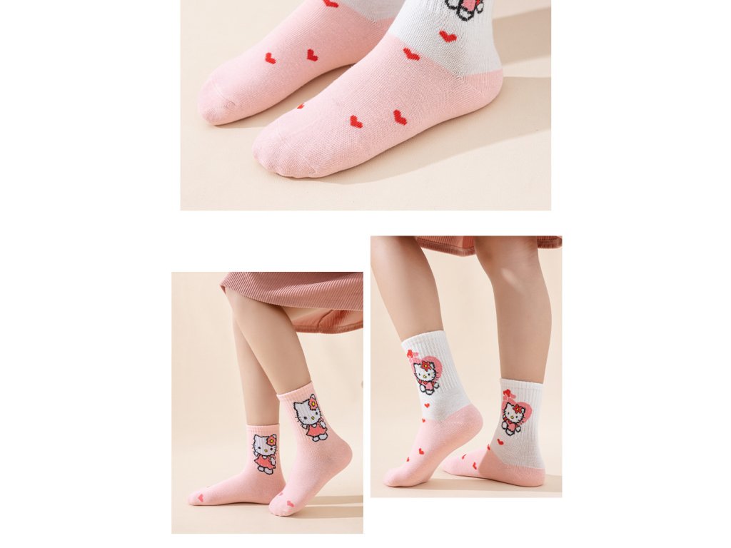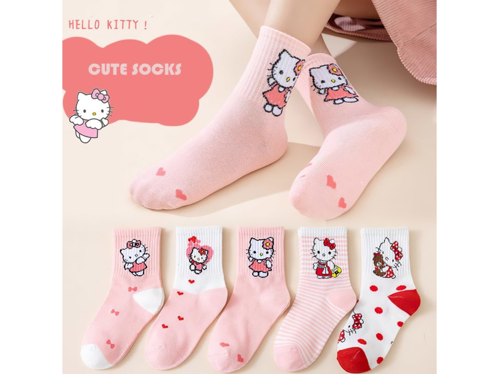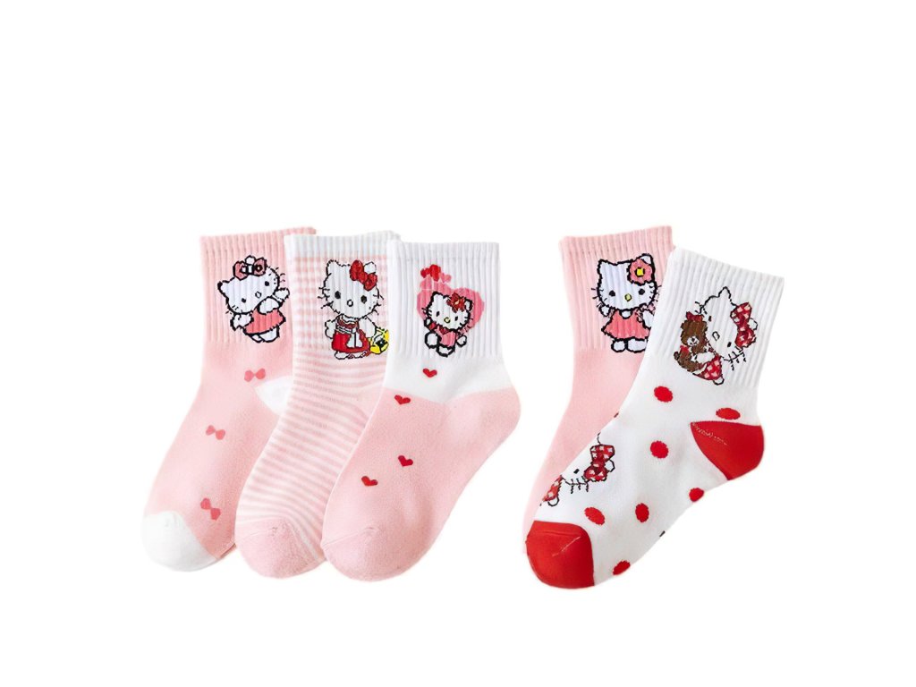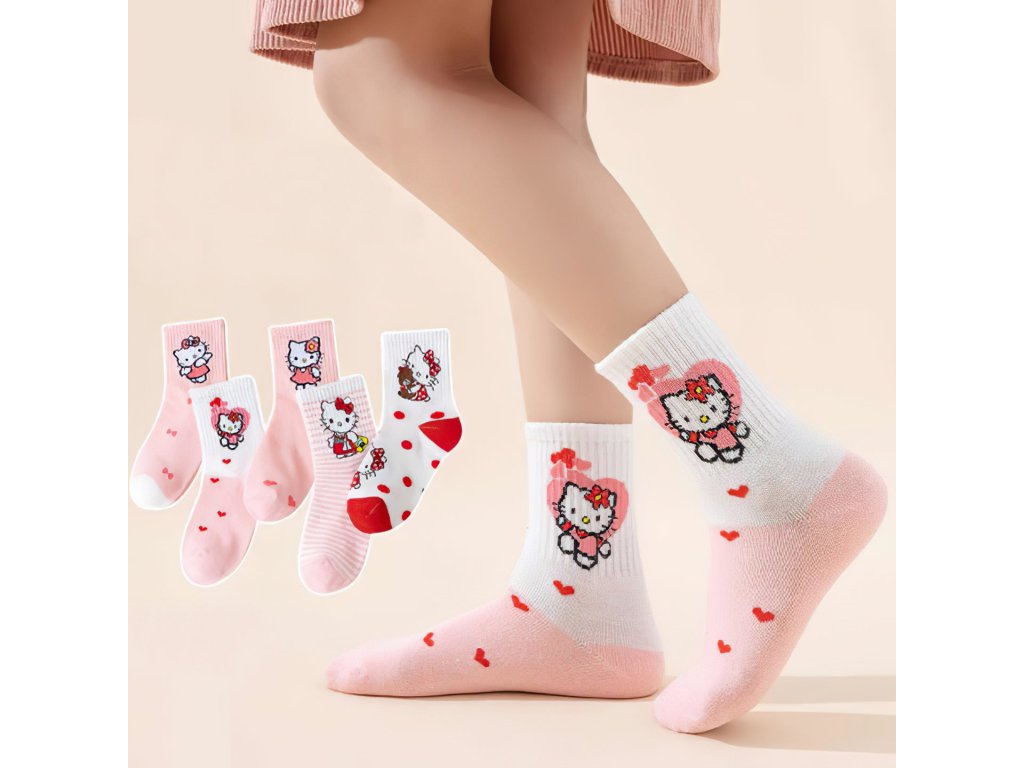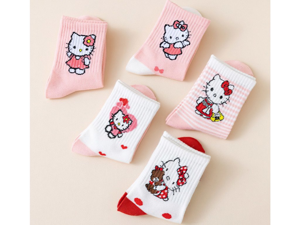 Každé balení obsahuje pět různých párů, které spojuje jemný design a ikonická postavička Hello Kitty v různých variacích. Barevná kombinace růžové, bílé a červené je hravá a snadno se kombinuje s ostatním dětským oblečením.