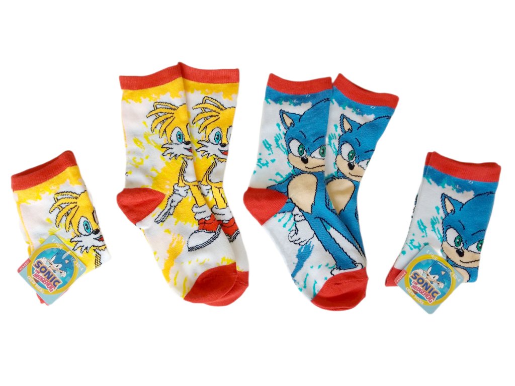 Balení obsahuje čtyři páry ponožek – dva páry s modrým Sonicem a dva páry se žlutým Tailsovým motivem. Barevné provedení je výrazné a dynamické, přesně jako jejich herní hrdinové.