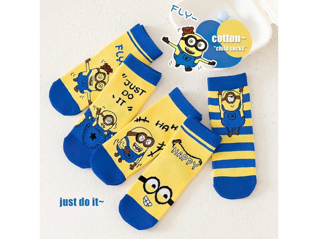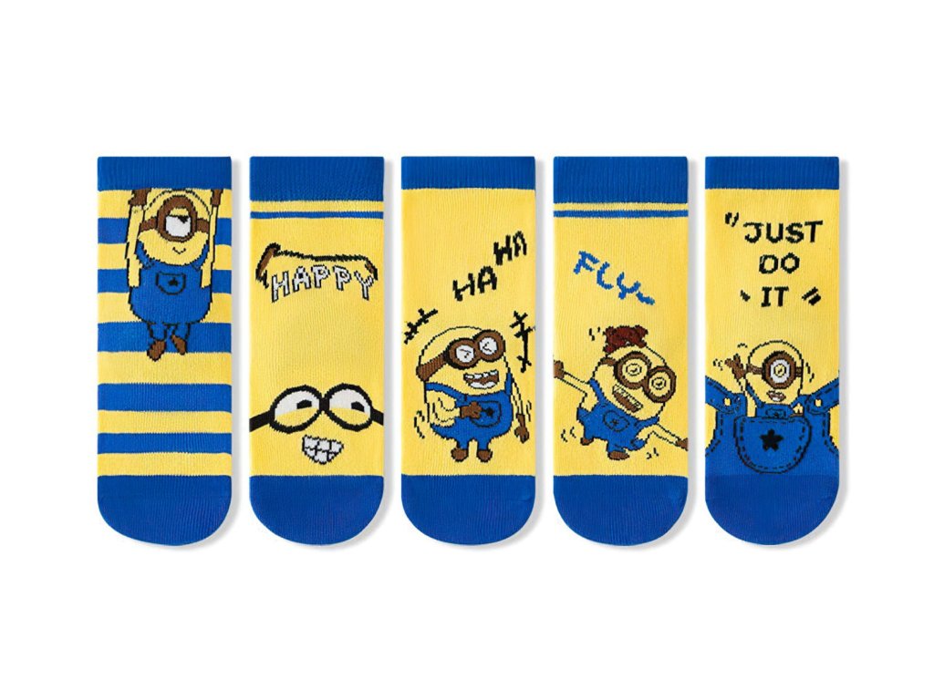 Balení obsahuje 5 párů ponožek s různými vtipnými výrazy a obrázky Mimoňů v jejich typických žlutých a modrých kombinacích. Každý pár je jiný, takže každý den může být jiná legrace.