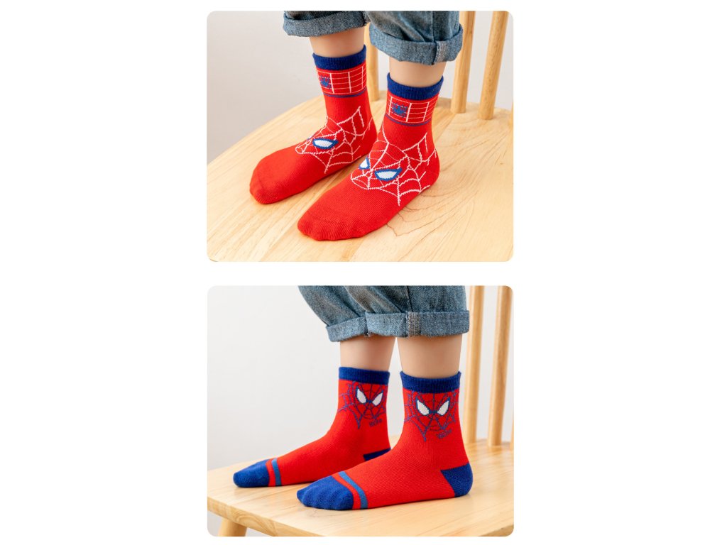 V balení najdete 5 různých párů ponožek s veselými a barevnými motivy jako jsou pavučiny, maska Spidermana nebo s nápisem. Ponožky jsou vyrobené z příjemného a pružného materiálu, který zajistí pohodlí po celý den. Elastický lem dobře drží na noze a zároveň neškrtí. Kombinace červené, modré a šedé barvy z nich dělá zábavný doplněk na doma, do školky i na ven.