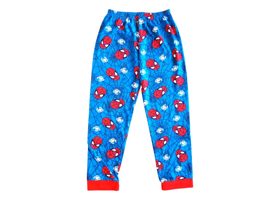 Kalhoty jsou v kontrastní modré barvě s celoplošným vzorem pavučin, Spider-Manových masek a pavouků, což skvěle doplňuje tričko. Elastický pas zajišťuje pohodlné nošení bez škrcení, zatímco červené manžety na nohavicích zabraňují vyhrnování a dotvářejí celkový superhrdinský vzhled. Díky volnému střihu poskytují kalhoty dostatek prostoru pro pohyb a pohodlí během spánku i domácího lenošení.