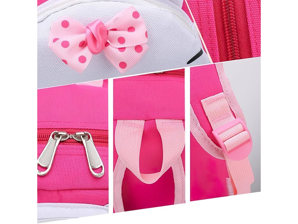 Batoh je vyroben z pevného a odolného polyesteru, který je snadno omyvatelný a zvládne každodenní používání. Dvě kulaté kapsičky ve tvaru nožiček s nápisem a srdíčkem slouží jako praktické úložné prostory na drobnosti, zatímco hlavní komora nabízí dostatek místa na svačinu, oblečení nebo hračky.