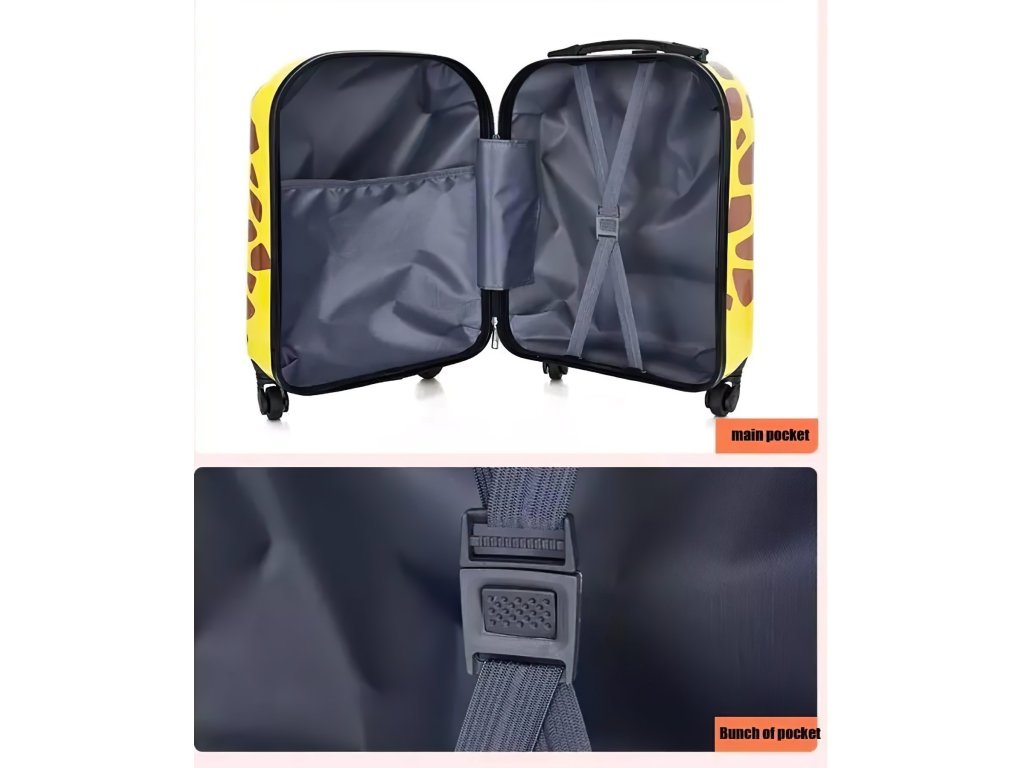 Dětský kufr na kolečkách s designem žirafy je perfektním společníkem pro malé cestovatele a jejich dobrodružství.