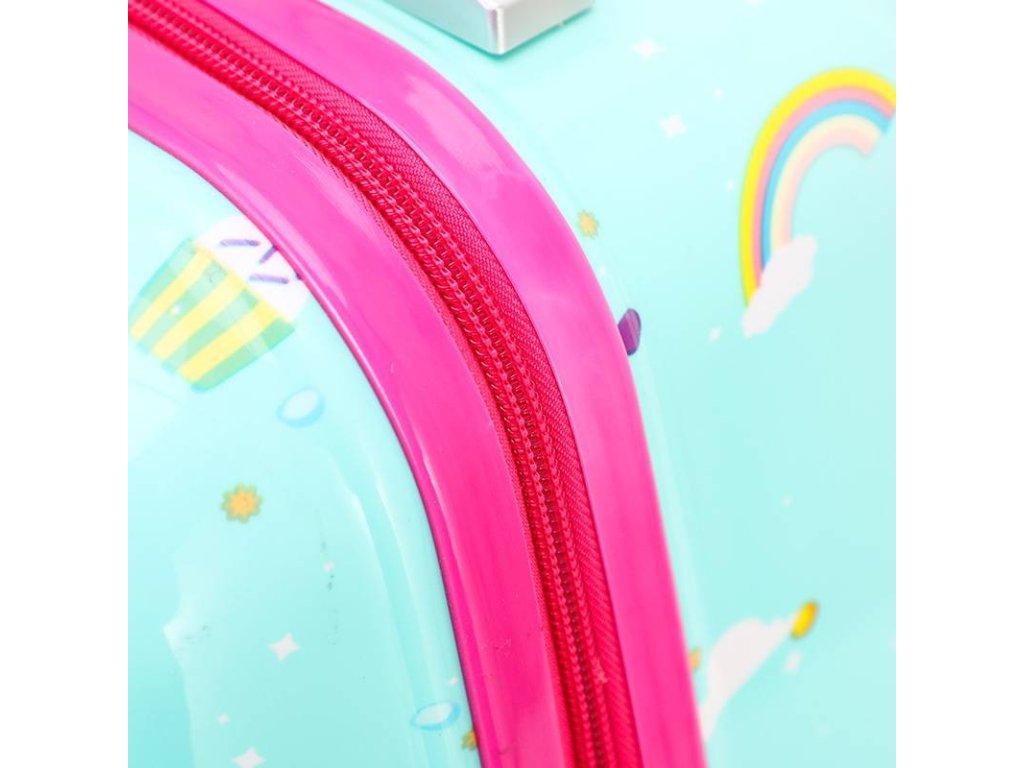 Tento kufr vyniká svým rozkošným a hravým designem, který zobrazuje dětsky stylizovaného jednorožce s duhovou hřívou a ocasem, sedícího na obláčku s duhou v pozadí. Motiv je doplněn srdíčkem a barevným pozadím, kombinující světle modré a růžové barvy. Díky tomuto okouzlujícímu motivu jednorožce nadchne děti a povzbudí jejich nadšení pro cestování. Kufr je ideální pro prázdninové výlety, přespání u rodiny a kamarádů, školní nebo předškolní akce. Je nejen praktický, ale také stylový a zábavný.