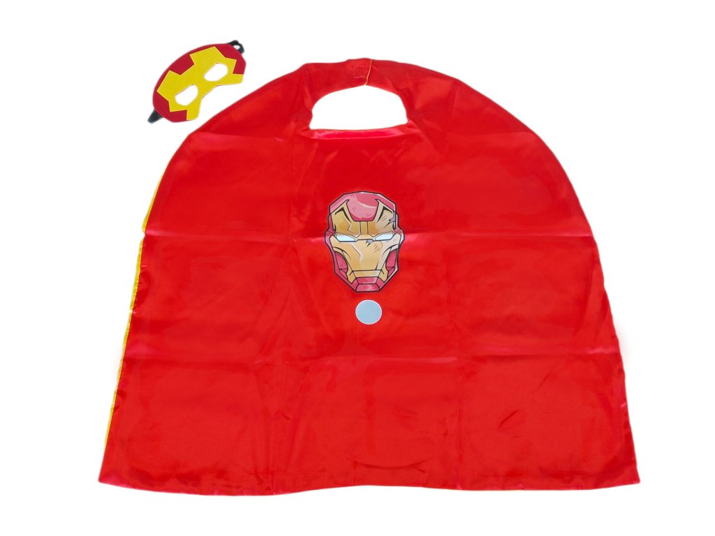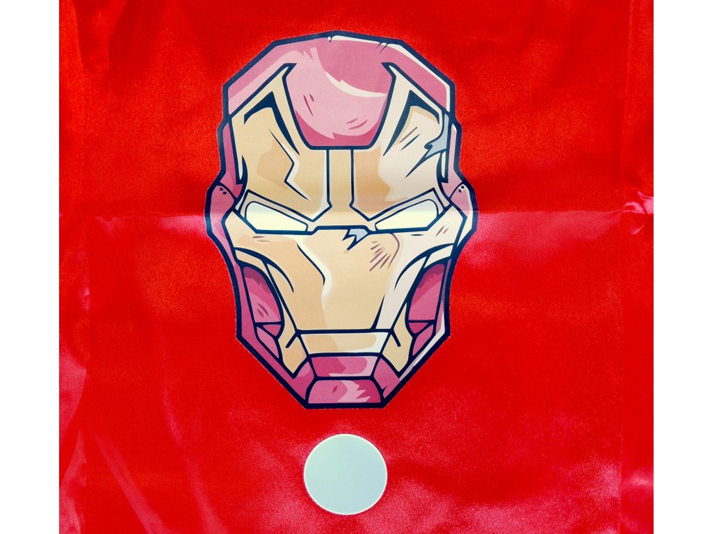 Set obsahuje sytě červený plášť s potiskem Iron Manovy masky a svítícího reaktoru na hrudi. Doplňuje ho ladící plstěná maska ve stylu helmy Tonyho Starka, která drží pomocí pružné gumičky a je navržena pro pohodlné nošení bez otlaků.