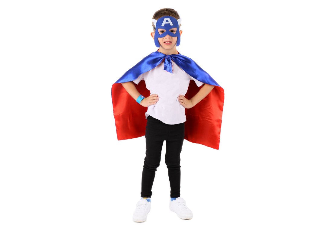 Plášť je vyroben z lesklého saténu, který je příjemný na dotek a pohodlný na nošení. Jeho modro-červené provedení působí dynamicky a živě, zatímco velký motiv ikonického hvězdného štítu na zádech dává kostýmu autentický vzhled. Plášť je vybaven suchým zipem u krku, což usnadňuje jeho oblékání i svlékání, a to během pár vteřin. Saténový materiál dodává převleku zářivý lesk, který přitáhne pozornost a zároveň zajišťuje, že se dítě bude cítit pohodlně i při dlouhodobém nošení.