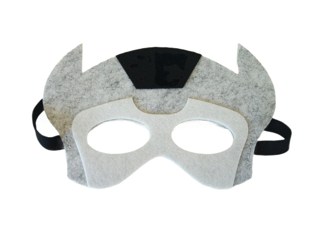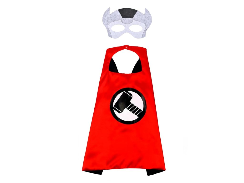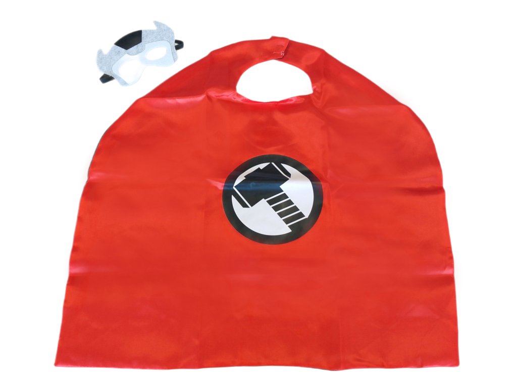 Součástí setu je červený plášť s černobílým potiskem Thorova kladiva, které je symbolem moci a spravedlnosti. Doplňuje ho originální maska z plsti s rohy a typickým motivem Thora, která skvěle padne a drží pomocí pružné gumičky.