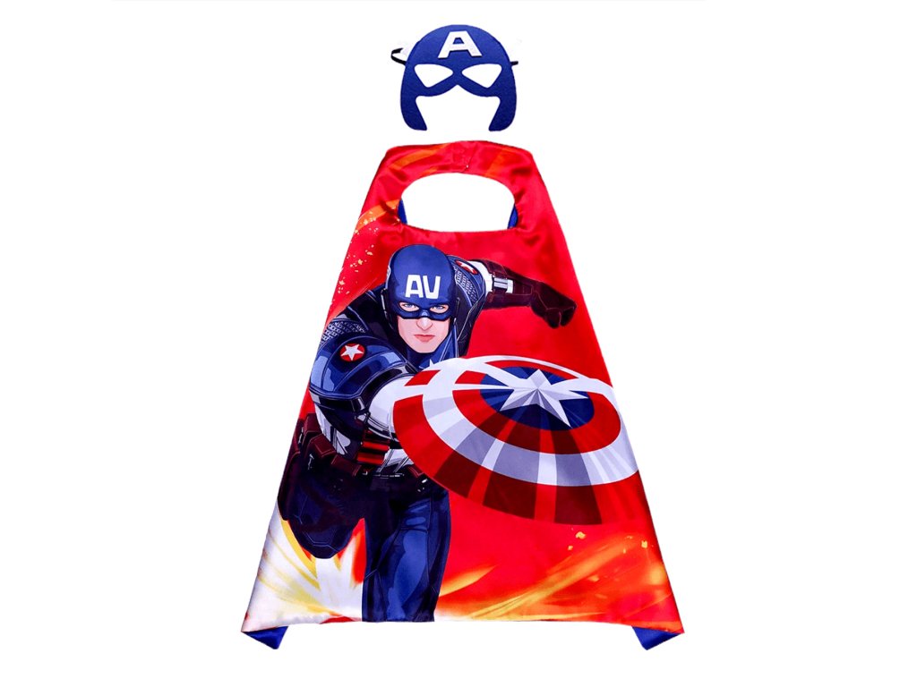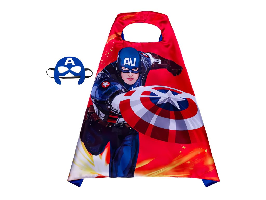 Součástí kostýmu je výrazný červený plášť s potiskem Kapitána Ameriky v akci a ikonickým štítem, symbolem odvahy a spravedlnosti.