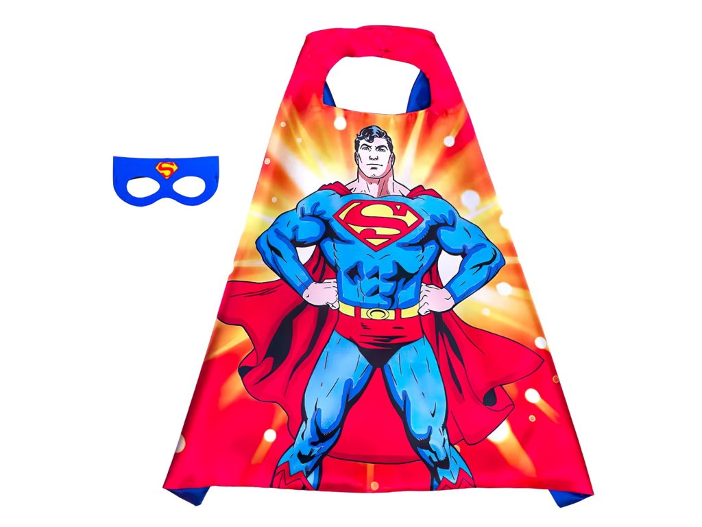 Sada obsahuje výrazný plášť s potiskem legendárního Supermana ve své klasické póze a modrou masku se symbolem „S“, díky čemuž se dítě snadno vžije do role zachránce světa.