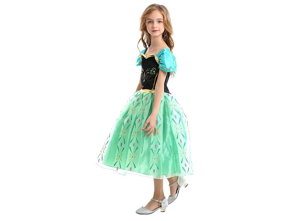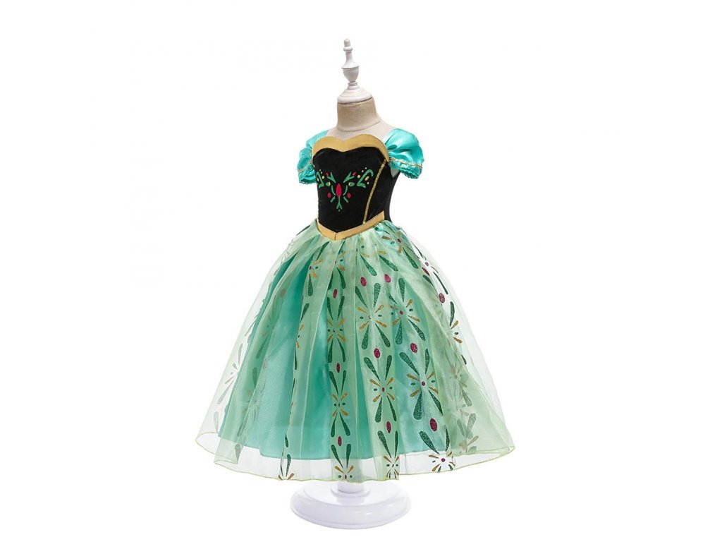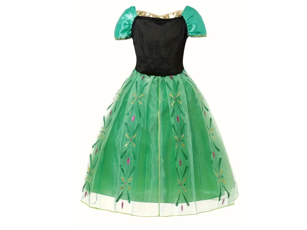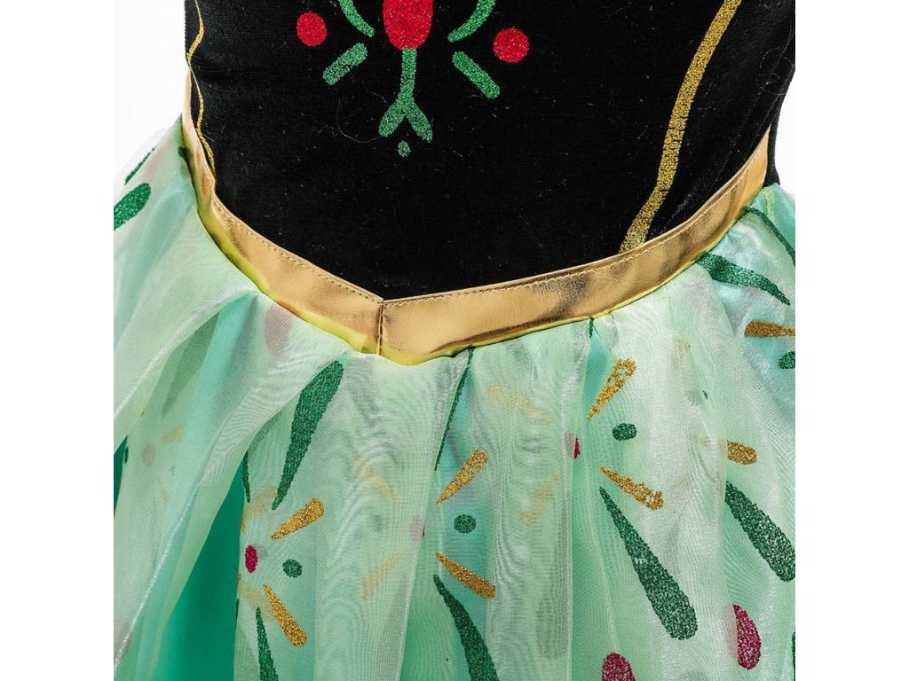 Sukně kostýmu je vytvořena z několika vrstev tylu, které vytvářejí objemný, vzdušný vzhled, ideální pro princeznu. Hlavní vrstva je pokryta nádhernými květinovými vzory, které se třpytí ve světle a dodávají kostýmu jiskru. Zelená barva sukně kontrastuje s černým živůtkem a společně vytvářejí harmonickou kombinaci, která je věrná Annině vzhledu z filmu.