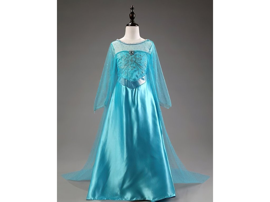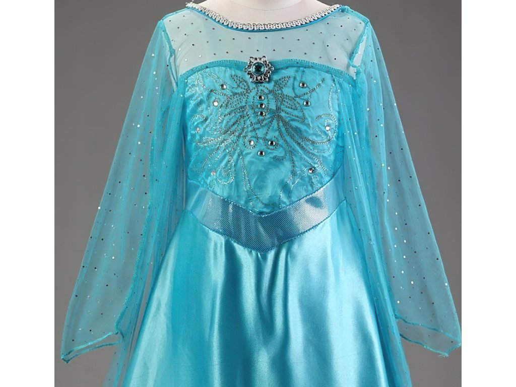 Kostým zahrnuje nádherné saténové šaty v tyrkysových modrých tónech, které září a připomínají ledové království. Šaty jsou zdobeny jemnými detaily, jako jsou flitry a kamínky nebo brož na prsou, které přidávají na eleganci. V pase je všitá pružná gumička, aby byly šaty pohodlné a dobře padly každé postavě. Dlouhé rukávy jsou vyrobeny z průhledné látky, což dodává šatům vzdušný a lehký vzhled.