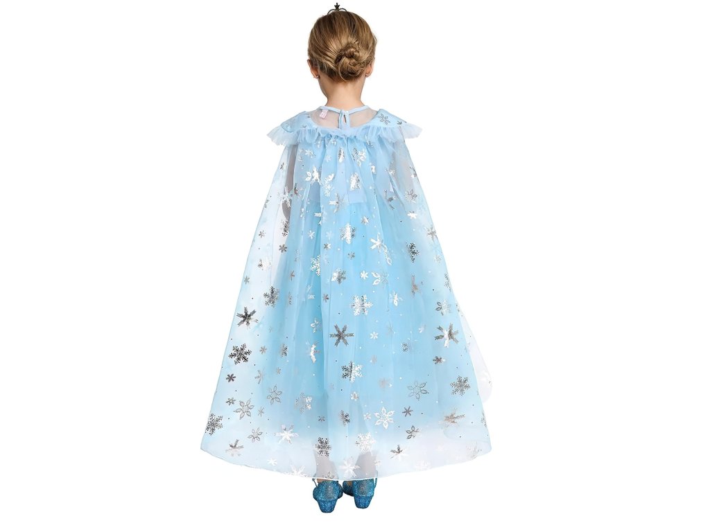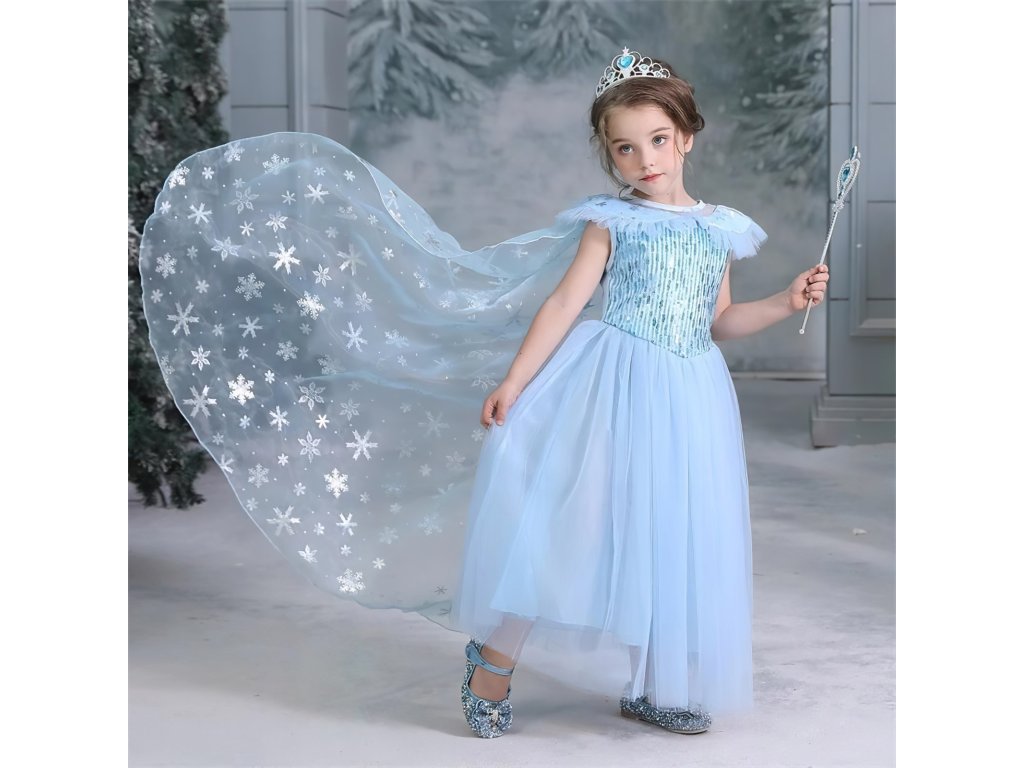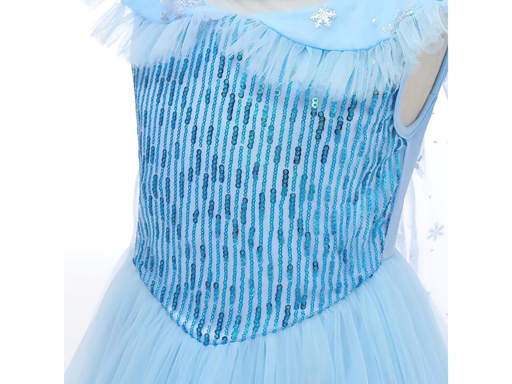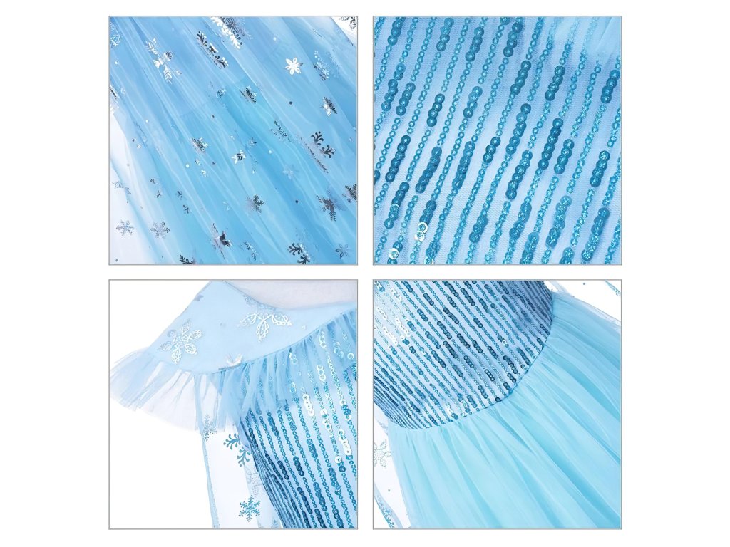 Dětský karnevalový kostým Elsa snow s vlečkou. Šaty kostýmu jsou podšité jemnou hladkou podšívkou a zvenku jsou zdobeny flitry, které vytvářejí nádherný odlesk na šatech. Sukně je vrstvená a lehká. V zadní části je umístěna vlečka, která je zdobená potisky vloček a dotváří celkový dojem k dokonalosti. Kostým s krásnými doplňky zaručí půvab každé malé královny. Nechte svou malou princeznu zažít magii s kouzelným dětským karnevalovým kostýmem Elsy z filmu Ledové království.