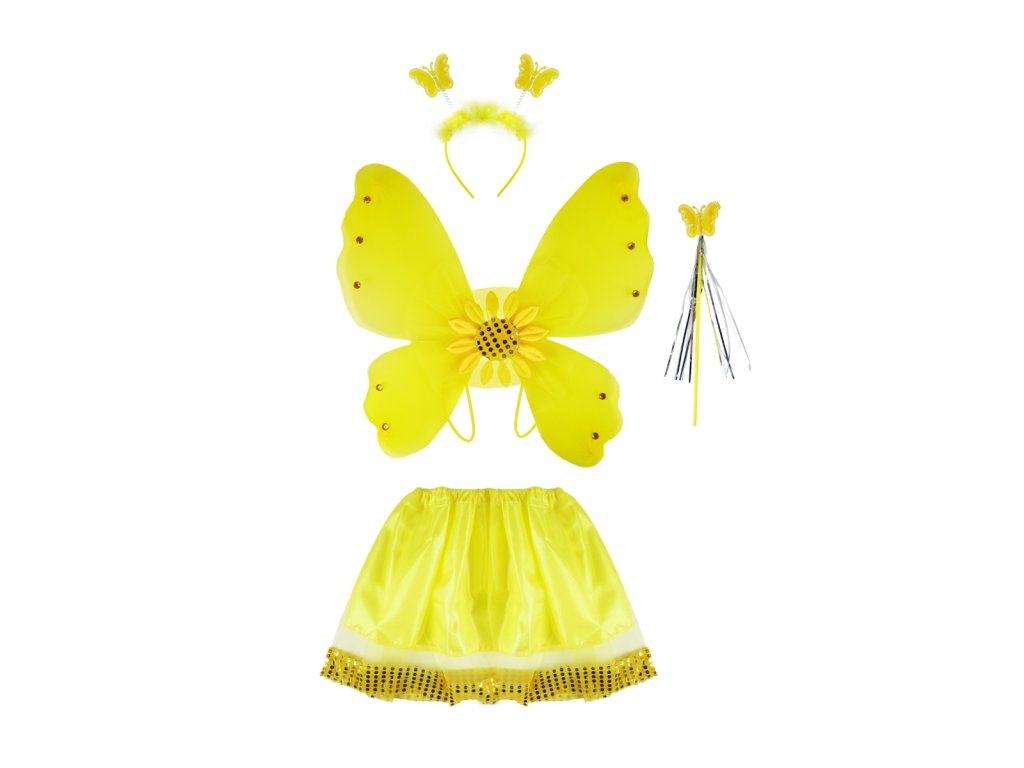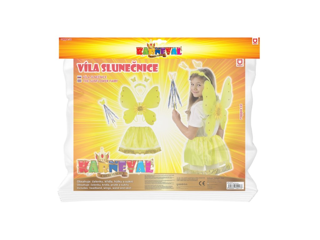 Kostým ve stylu slunečnice pro holčičky na karneval! Kostýmek je určen pro děvčata ve věkovém rozmezí 3-10 let. Balení obsahuje nadýchanou sukýnku, která je ve spodní části lemována zlatými flitry, křídla se slunečnicí a ozdobnými kamínky, čelenku s metalickými motýlky a k tomu sladěnou hůlku. Rozměry balení: Š×V×H - 400×600×60 mm. Upozornění ! V případě, že u zboží svítí skladem v externím skladu - je dodání zboží mezi 3 - 7prac. dny. Děkujeme a pochopení. Výrobce/dodavatel na trh v EU: RAPPA s.r.o., Za Humny 1082, 725 25 Ostrava-Polanka, obchod@rappa.cz Upozornění: Nenechávejte dítě samo bez dozoru. Obal není hračka, odstraňte ho z dosahu dítěte. Dbejte pokynů výrobce, uvedených na obalu.Doplňkové parametry