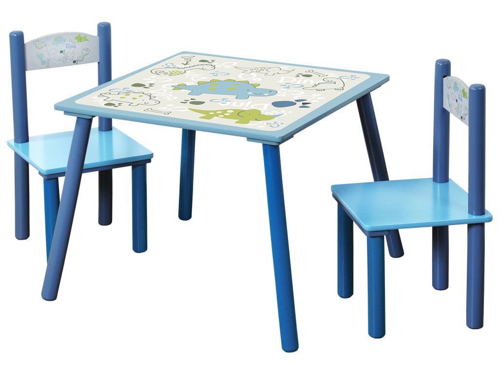 Dětský stůl s židlemi s motivem dinosaurů v zajímavé barevné kombinaci modré a bílé od německého výrobce. Stoleček je ideálním místem pro hraní, malování, občerstvení nebo pro posezení s kamarády. Originální doplněk do dětského pokoje, praktický, přizpůsobený dětským potřebám. Nábytek je robustní a stabilní,snadno se čistí.