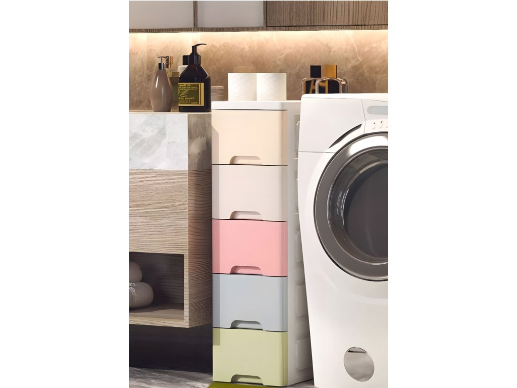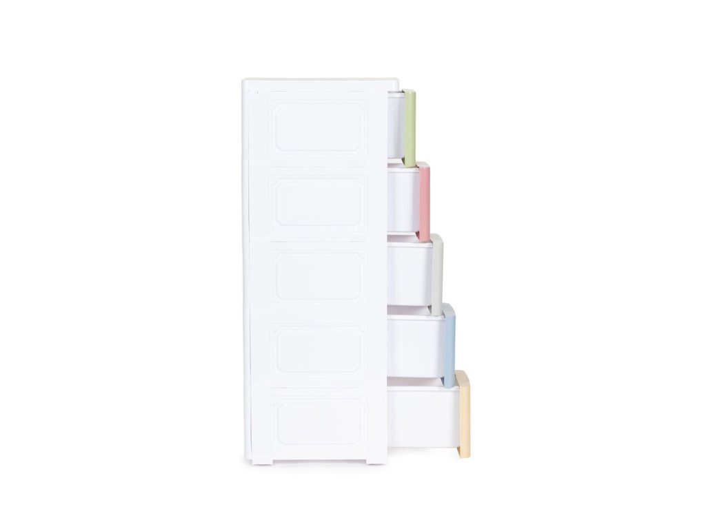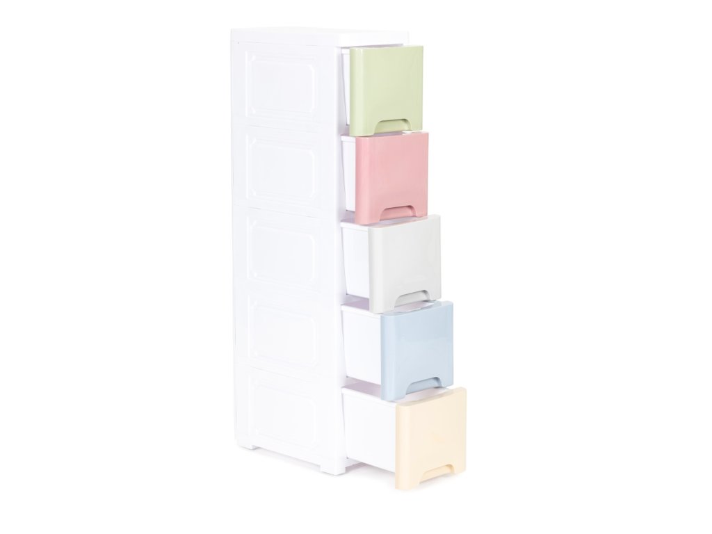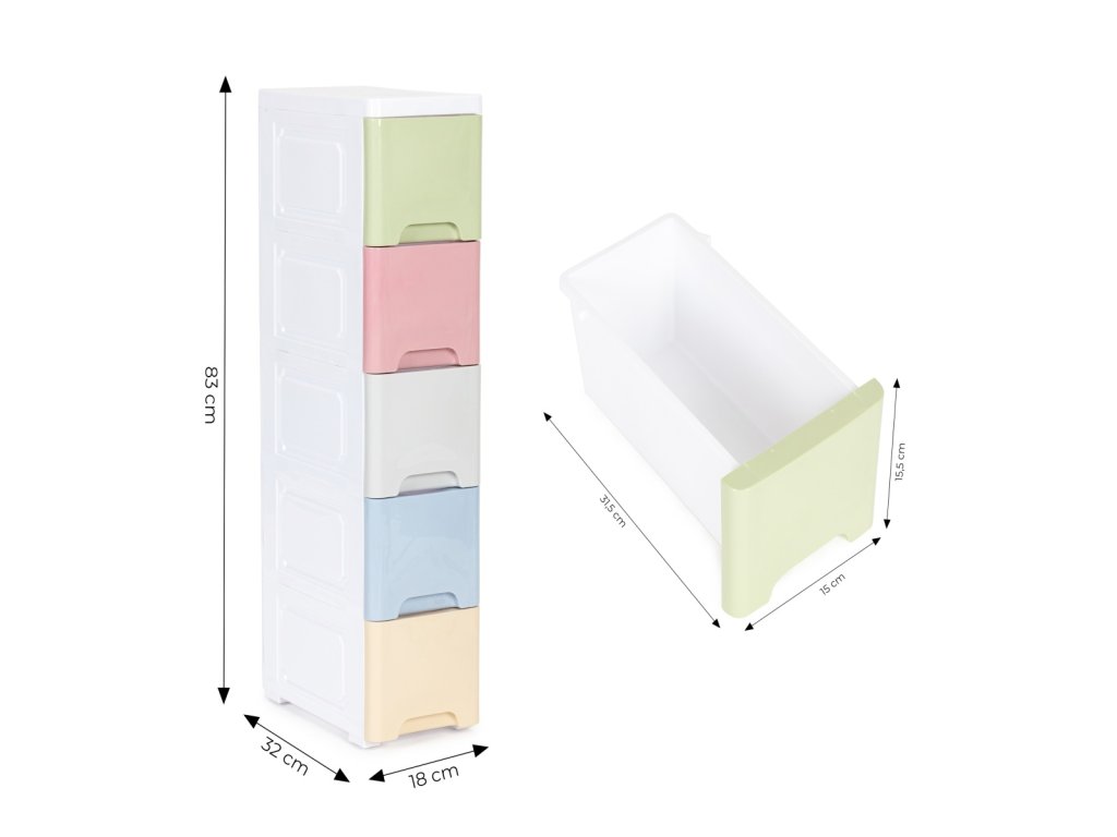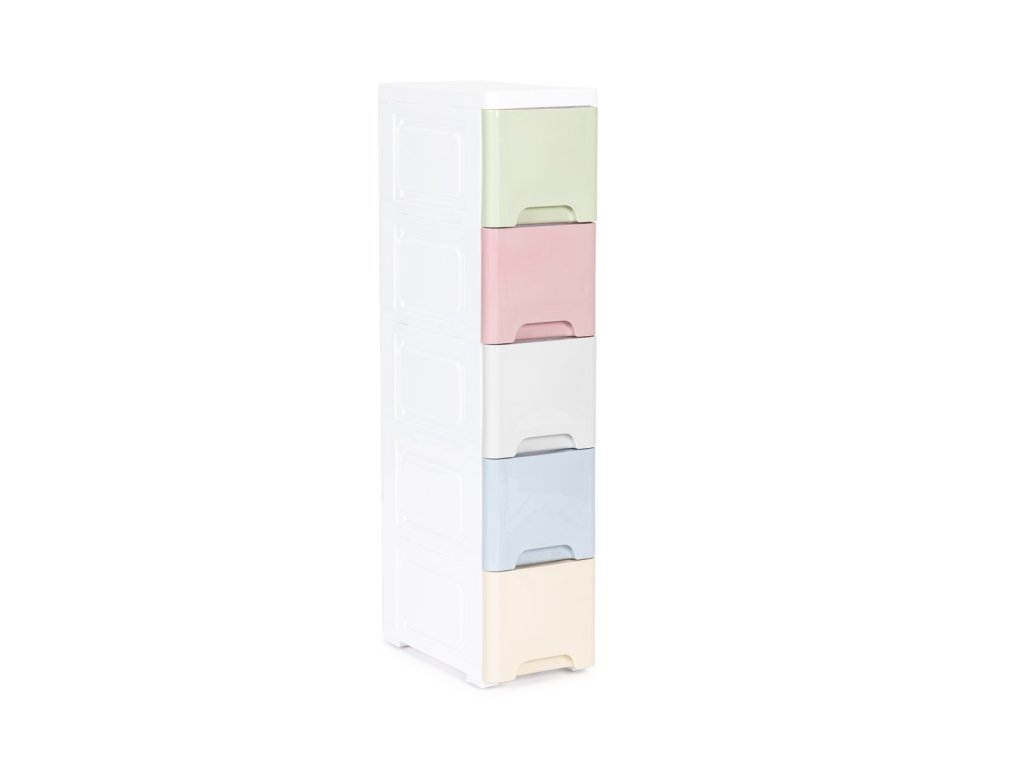 Dětský regál s pěti zásuvkami. Ideální do dětského pokoje nebo koupelny. Pět zásuvek s pohodlnými úchyty. Blokace zásuvek zabraňuje jejich vypadnutí. Nohy s kolečky pro snadné přesouvání. Pevná a odolná konstrukce. Snadná montáž bez složitostí. Produkt značky ModernHome. Ideální na ukládání. Regál na kolečkách je funkční a praktické řešení pro přehledné ukládání nejrůznějších věcí. V dětském pokoji skvěle poslouží jako místo na hračky, knížky i výtvarné potřeby. V koupelně je stejně užitečný a pojme vaši kosmetiku i další doplňky, které chcete mít vždy po ruce. Odolný plast zajišťuje dlouhou životnost a bílý rám mu dodává moderní a čistý vzhled, který snadno sladíte s interiérem. Regál se skládá z pěti barevných zásuvek se speciálně tvarovaným předním úchytem pro pohodlné vysouvání a zasouvání. Bezpečná řešení. Zásuvky jsou vybaveny blokacemi, které účinně brání jejich vypadnutí z rámu regálu. To je obzvlášť důležité, když mají k nábytku přístup děti. Díky blokacím se nemusíte obávat o bezpečnost ani tehdy, když jsou zásuvky plně naložené. Snadné přemísťování. Díky kolečkům ve spodní části lze regál snadno přesouvat tam, kde ho právě potřebujete. Uspořádání prostoru můžete měnit kdykoli a přizpůsobit regál aktuálním potřebám místnosti. Specifikace. Rozměry: 83 × 32 × 18 cm. Rozměry zásuvky: 31,5 × 18 × 15,5 cm. Hmotnost: 3,2 kg. Rozměr balení: 36 × 36 × 28 cm. Počet zásuvek: 5 kusů. Barva: vícebarevná/bílá. Materiál: plast. Produkt značky: ModernHome. Upozornění: Obal není hračka, odstraňte ho z dosahu dítěte. Nenechávejte dítě bez dozoru. Dbejte pokynů výrobce. Umístěte a používejte výrobek na rovném a stabilním povrchu. Nepřetěžujte zásuvky a nelezte na výrobek.Doplňkové parametry