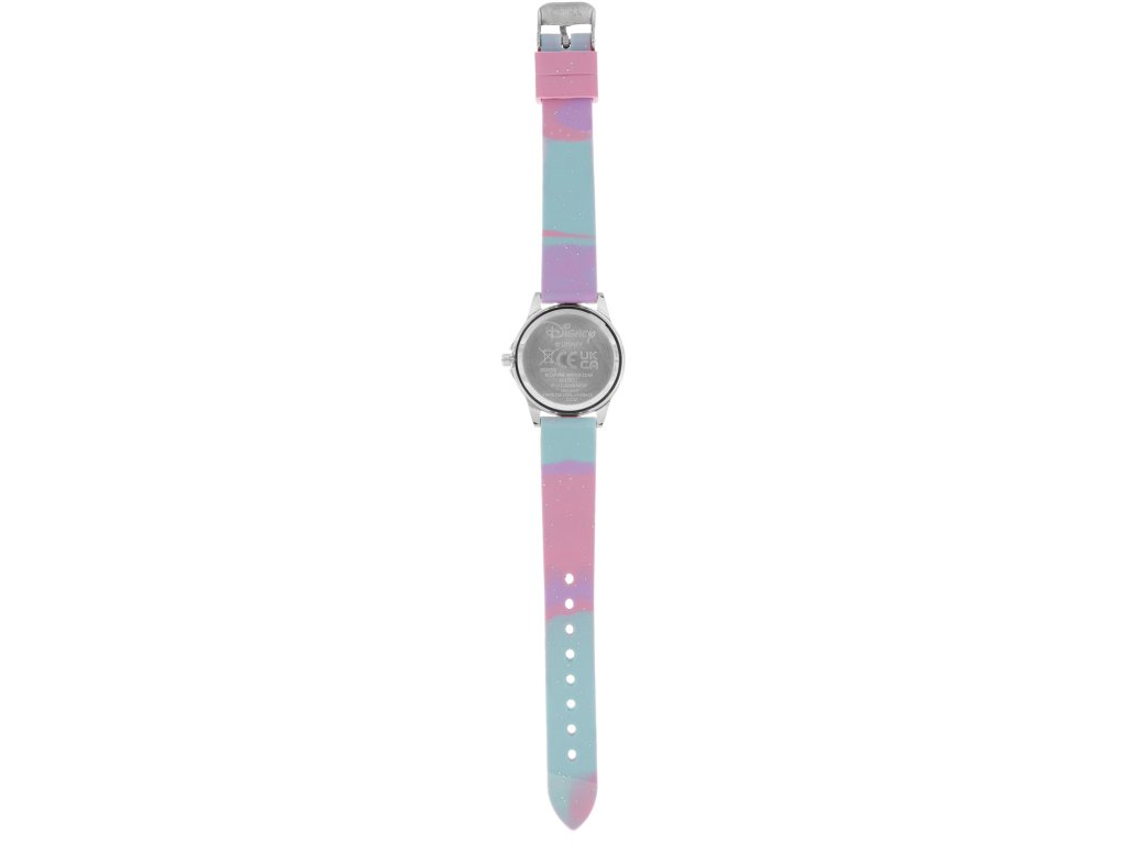 Analogové hodinky mají ocelové pouzdro, číselník o průměru 30 mm a dobře viditelné ručičky a číslice. Pestrobarevný řemínek v růžovo-fialových tónechje plastový a má kovovou sponu. Hodinky na ruce skvěle a pohodlně sedí, a tak není problém nosit je celý den.
