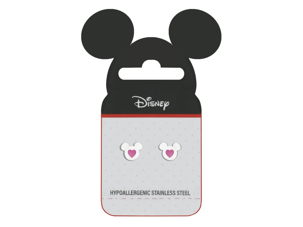 Náušnice ve tvaru postavičky myšáka Mickey Mouse od Disney jsou vyrobené z nerezové oceli. Působivé je srdíčko ze smaltu růžové barvy umístěné ve středu každé náušnice, které šperku dodává nádech jemnosti. Šperk je jednoduchého a čistého designu. Tyto náušnice se zapínají puzetkou, která zajišťuje pohodlné nošení a zabraňuje ztrátě náušnic. Jsou dodávány ve stylové krabičce.