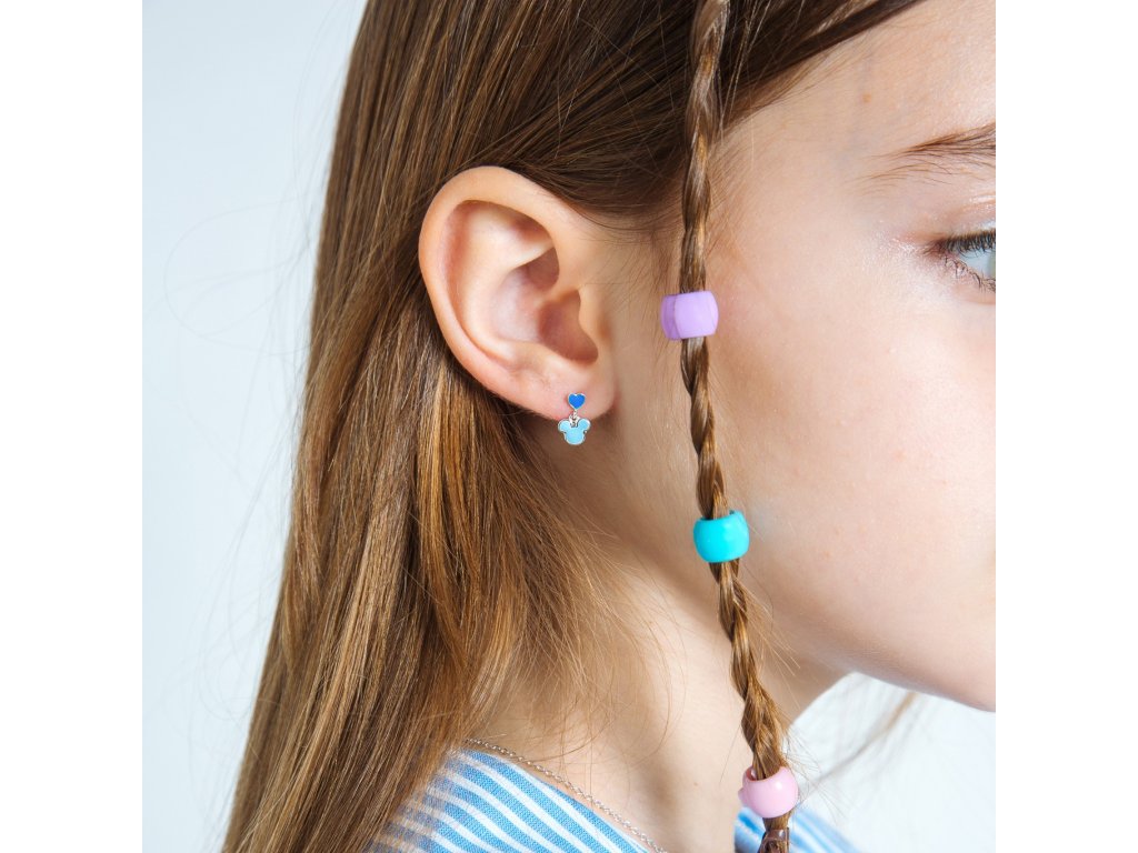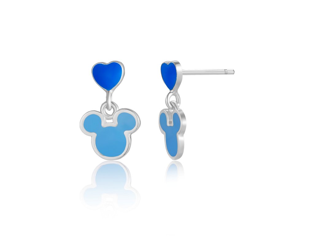 Tyto něžné náušnice jsou vyrobeny ze stříbra a zdobené pečlivě naneseným modrým smaltem tmavé barvy na srdíčku a světlejší modré barvy na hlavičce Mickeyho. Právě smalt jim dodává hravý a živý vzhled. Lesklá povrchová úprava zvýrazňuje detaily tohoto šperku a zajišťuje jeho elegantní design. Jednoduché zapínání na puzetu poskytuje pohodlné nošení po celý den.