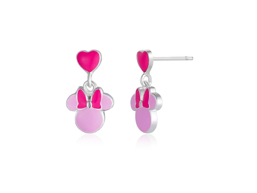 Tyto něžné náušnice jsou vyrobeny ze stříbra a zdobené pečlivě naneseným růžovým smaltem tmavší barvy na srdíčku a mašli a světlejší růžové barvy na hlavičce Minnie. Právě smalt jim dodává hravý a živý vzhled. Lesklá povrchová úprava zvýrazňuje detaily a zajišťuje elegantní vzhled. Jednoduché zapínání na puzetu poskytuje pohodlné nošení po celý den.