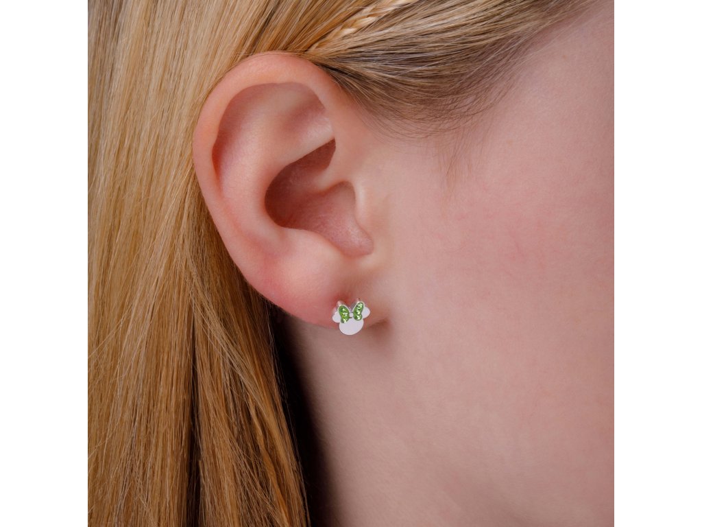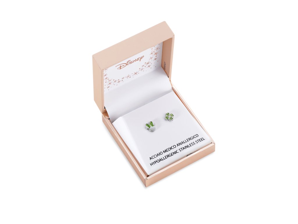Náušnice jsou vyrobené z nerezové oceli a dekorované smaltem a zářivými zelenými krystaly. Jedna je ve tvaru oblíbené postavičky Minnie Mouse, které nechybí typická mašle, a druhá ve tvaru čtyřlístku, symbolu štěstí.