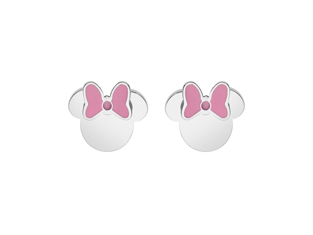 Minimalistické náušnice ve tvaru postavičky myšky Minnie Mouse od Disney jsou vyrobené z nerezové oceli. Šperku dominují mašle upravené růžovým smaltem, které s ocelovou barvou vytváří působivou kombinaci. Tyto náušnice se zapínají puzetkou, která zajišťuje pohodlné nošení a zabraňuje ztrátě náušnic. Jsou dodávány ve stylové krabičce.