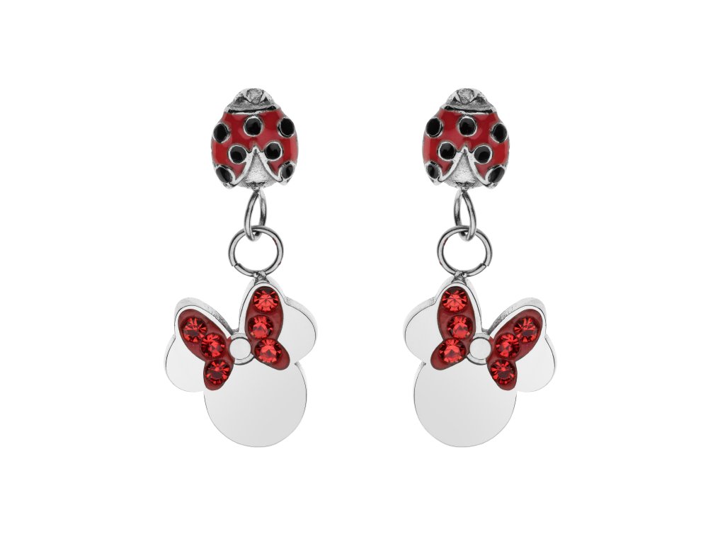 Místo puzetky na oušku sedí roztomilá beruška zdobená černými krystaly, ke které je připevněn přívěsek ve tvaru oblíbené myšky Minnie Mouse. Té nemůže chybět tradiční mašle, která se třpytí červenými krystaly.