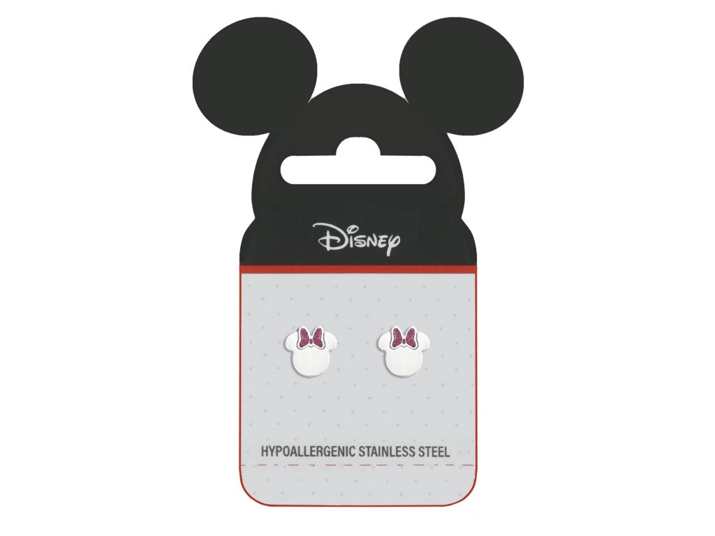 Náušnice ve tvaru postavičky myšky Minnie Mouse od Disney jsou vyrobené z nerezové oceli. Dominují jim mašle zdobené růžovými třpytkami, které šperk činí velmi něžným. Tyto náušnice se zapínají puzetkou, která zajišťuje pohodlné nošení a zabraňuje ztrátě náušnic. Jsou dodávány ve stylové krabičce.