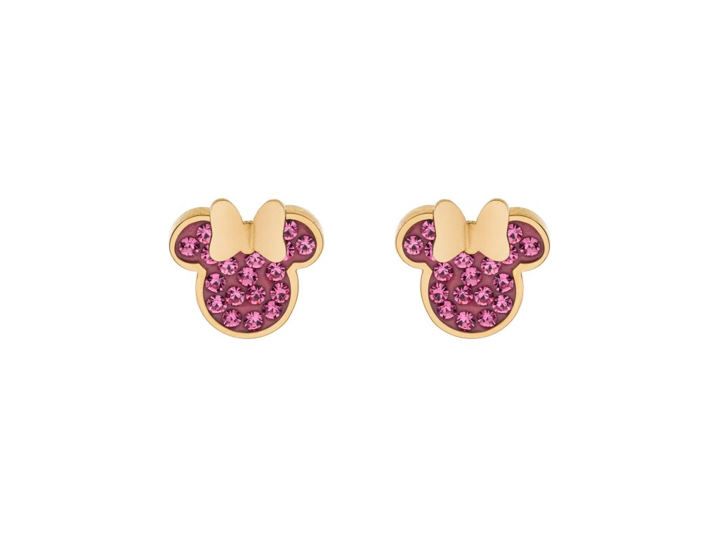 Náušnice ve tvaru oblíbené postavičky Minnie Mouse od Disney, které nechybí mašlička, jsou vyrobené z nerezové oceli, která je pozlacena. Ozdobené jsou třpytivými fialovými krystaly. Tyto dětské náušnice jsou dodávány ve stylové krabičce.