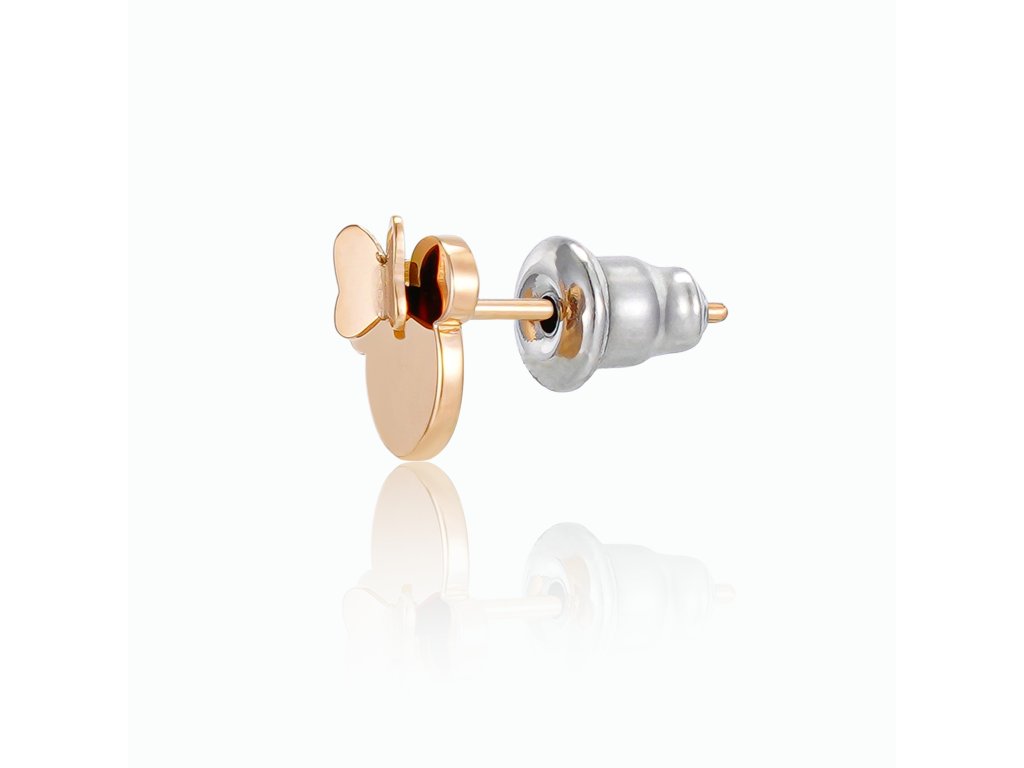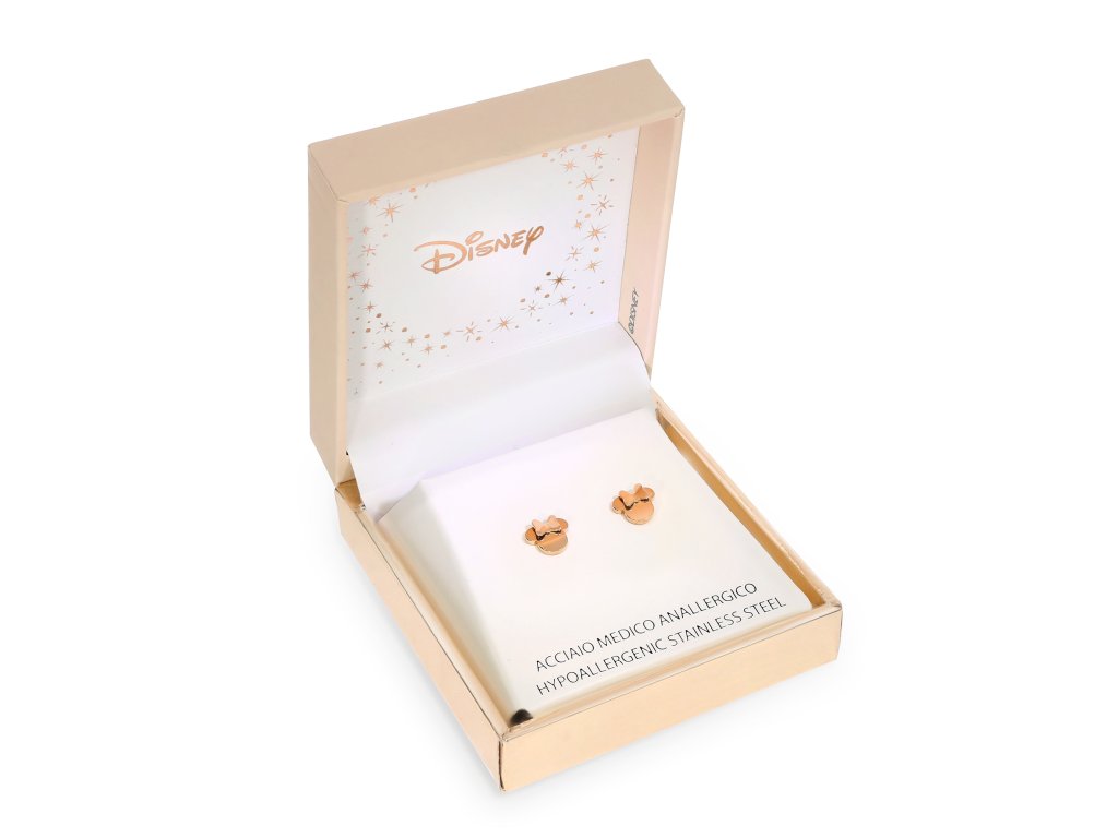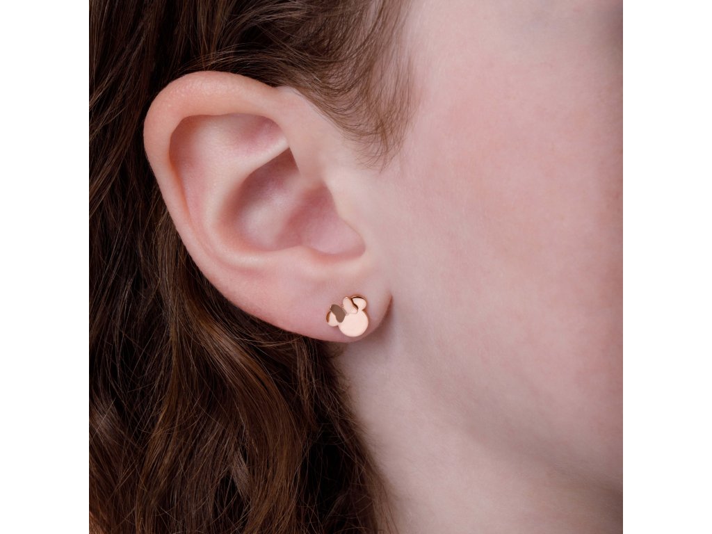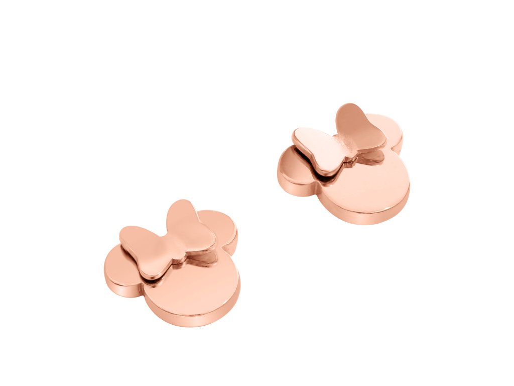 Drobné náušnice mají jednoduchý tvar hlavy oblíbené komiksové myšky a jsou vyrobené z nerezové oceli, která je pozlacena růžovým zlatem. Díky svému minimalistickému provedení jsou velmi univerzálním šperkem, který se hodí pro děti i dospělé.