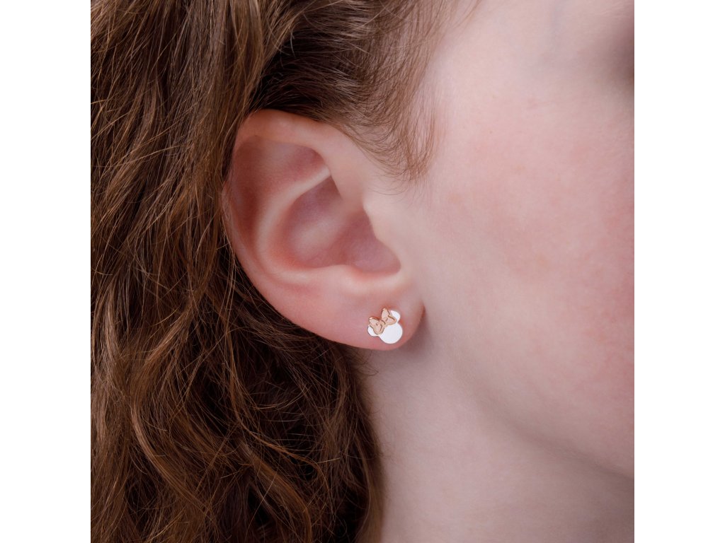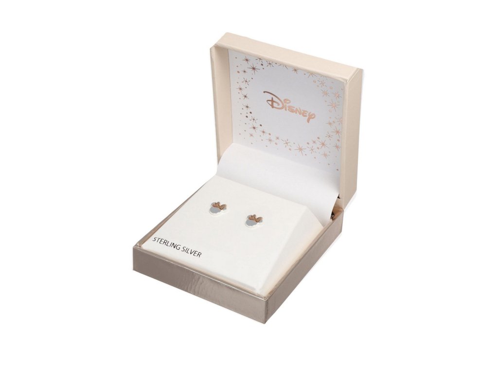 Náušnice ve tvaru postavičky myšky Minnie Mouse od Disney jsou vyrobené z velmi kvalitního stříbra ryzosti 925/1000 s lesklou povrchovou úpravou. Náušnicím dominuje růžovozlatě pozlacená mašle. Tyto náušnice se zapínají puzetkou, která zajišťuje pohodlné nošení a zabraňuje ztrátě náušnic. Jsou dodávány ve stylové krabičce. Váha šperku je 1,8 g.